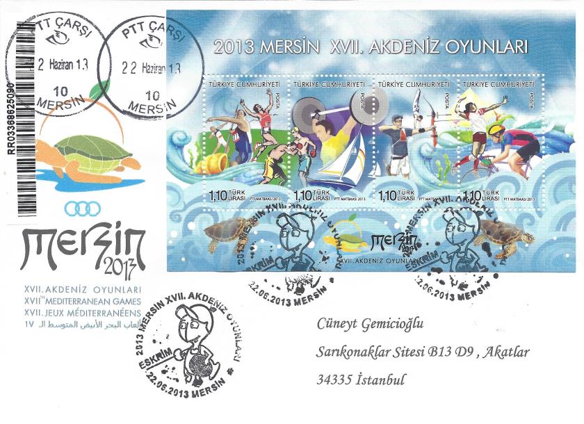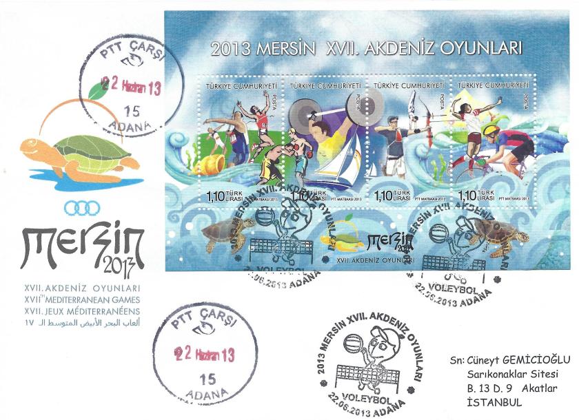 PTT 2013 yılında Mersin merkezli düzenlenen Akdeniz Oyunları için bir anma bloğu çıkarmış, oyunların açılışı için bir damga uygulamış ayrıca otuzbir dalda düzenlenen oyunların her dalı için bir Mersin, bir Adana olmak üzere iki adet damga uygulaması yapmıştır.