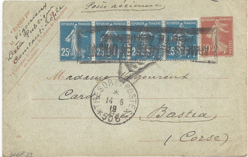 | Debt Publique – Kamu Borçları – Düyun-u Umumiye gönderici adresli hava postası ile İstanbul’dan Korsika adasına gönderilmiş bir frank ek pullu antiye kart |