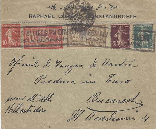 | Ülkemizin önemli erken dönem filatelistlerinden Raphael Cohen tarafından hava postası ile İstanbul’dan Bükreş’e gönderilmiş mektubun zarfı antetin üstünde Romen sansür damgası görülüyor |