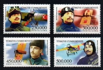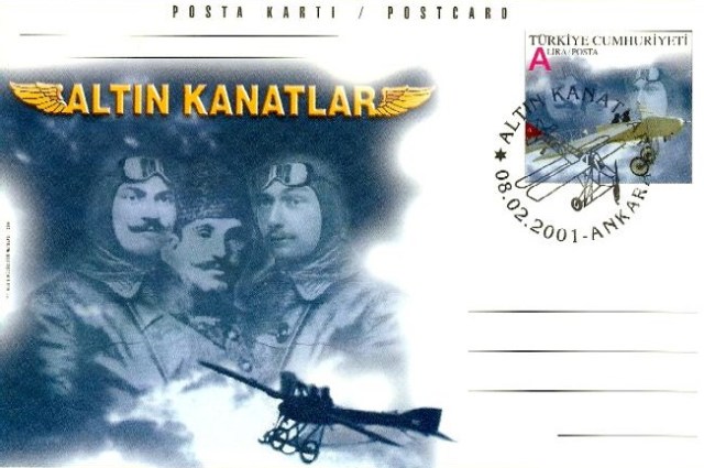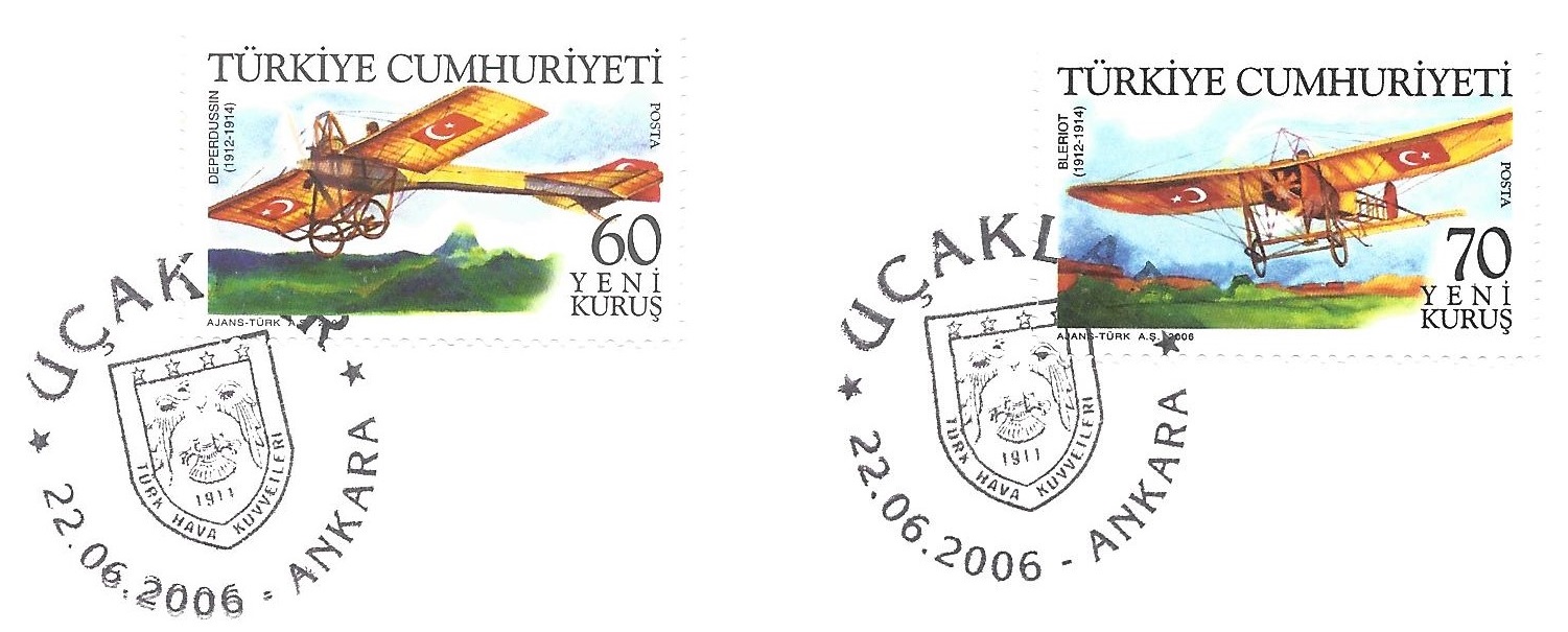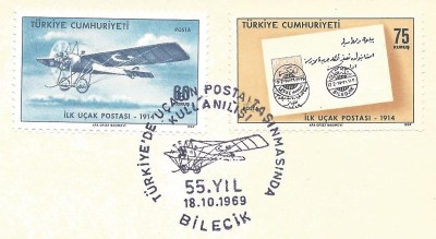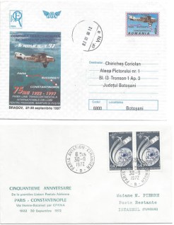 Yanda üstte ilk uçuşun 75. yılı anısına çıkarılan Romanya antiye zarfı, onun altında ise 50. yıl anısına yapılmış hatıra zarfı.
