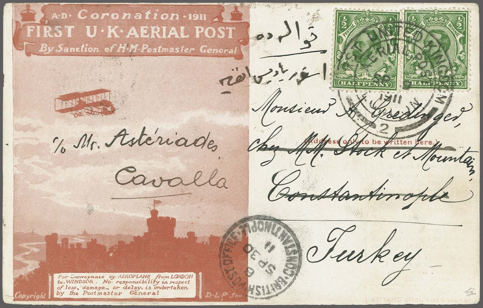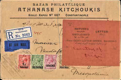Lozan Anlaşması sonrası İngiliz birlikleri İstanbul’dan çıkmaya başladıktan sonra, ancak İstanbul’un kurtuluşu gerçekleşmeden kısa bir süre önce 26 Auğustos 1923 tarihinde, Lozan Anlaşması gereğince İngiliz sömürgesi haline gelen, Mezopotamya – Irak adresli ve ingiliz Levant pulları ile ingiliz postahanesinden dönemin pul tüccarı Atanas Küçükis tarafından gönderilmiş , hava postaları zarfı.