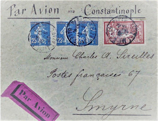 | 1923 yılı Mayısında Paris’ten İzmir’e fransız postaları ile gönderilmiş hava postaları zarfı |