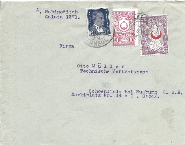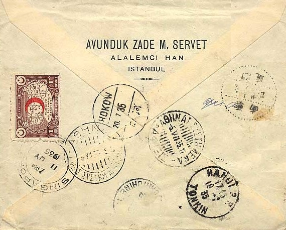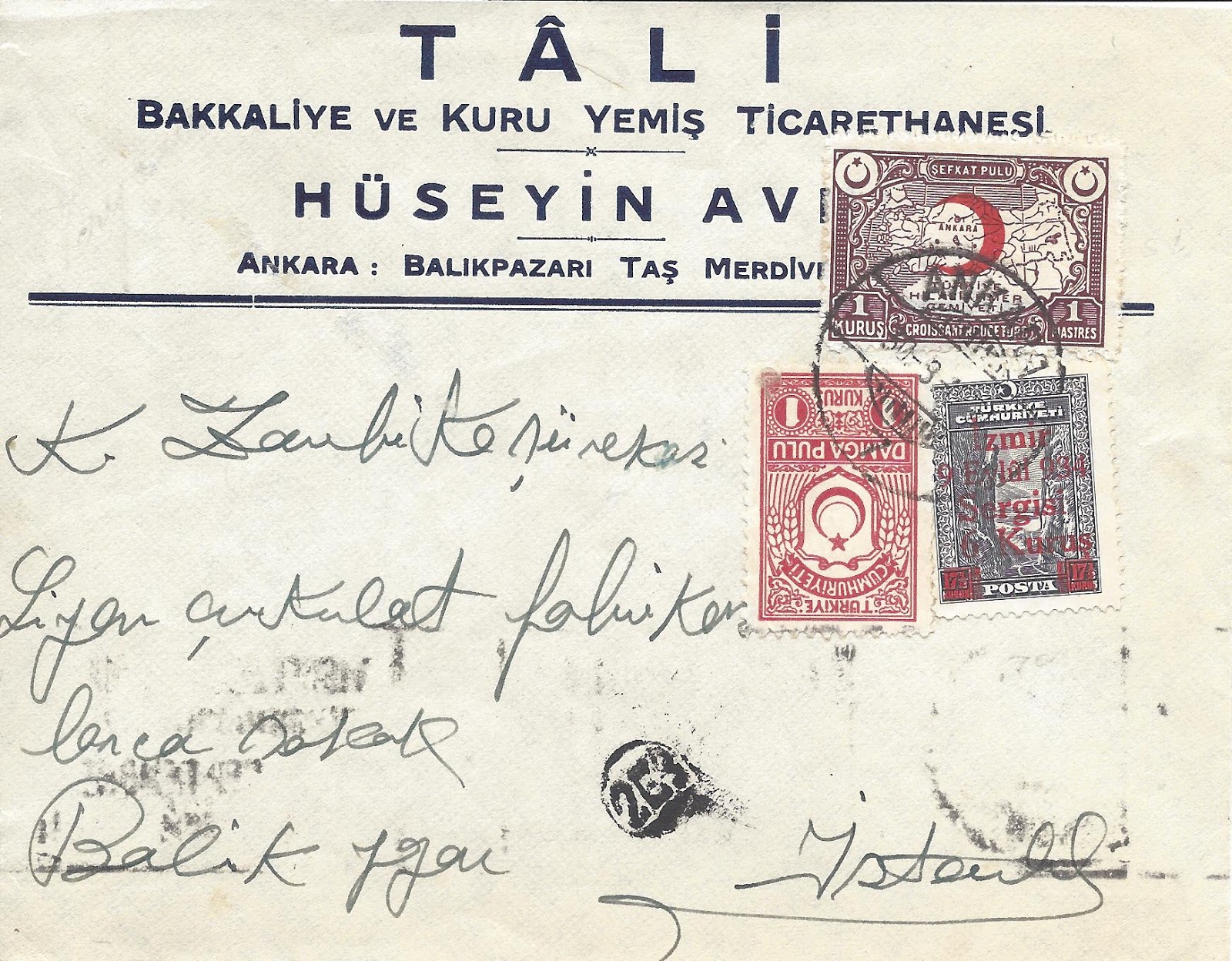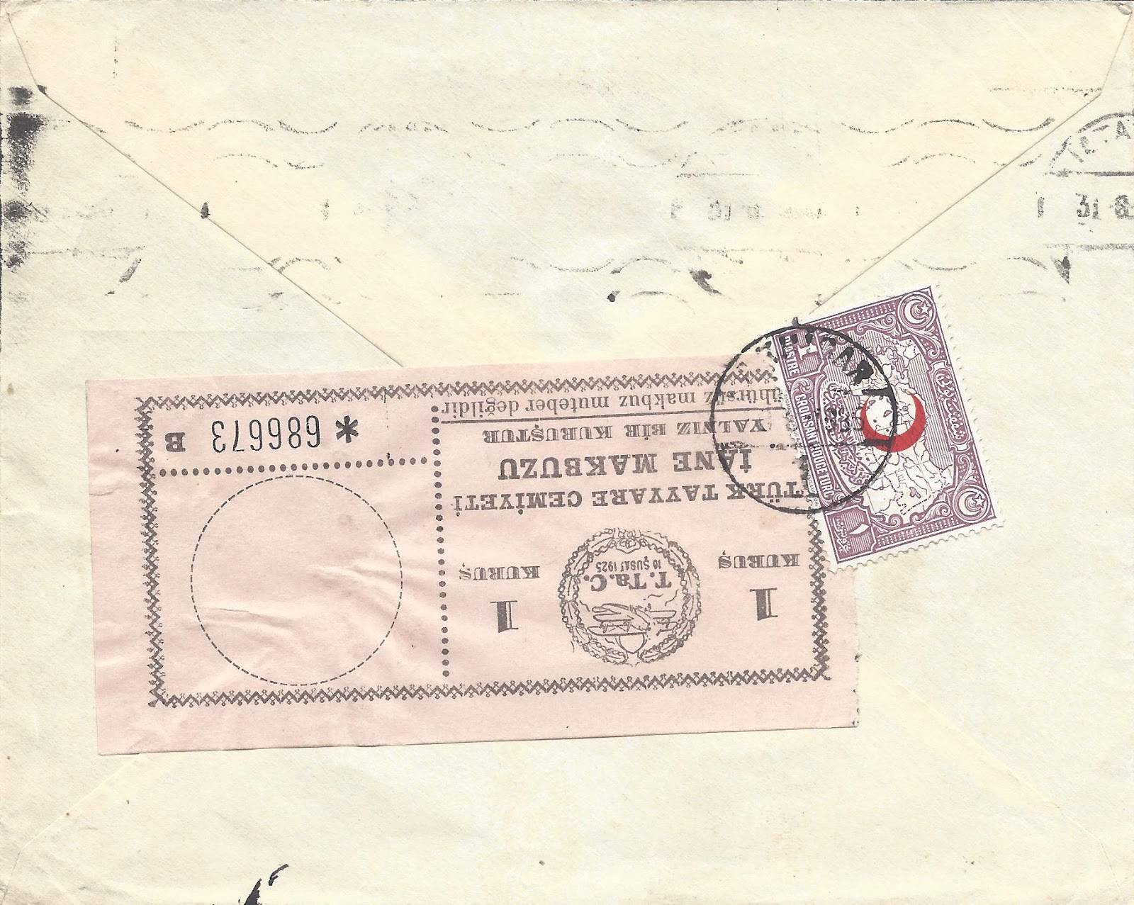 Aşağıda bulunan 30 Ağustos 1935 Akhisar damgalı zarfa ise kanuna uygun olarak yapıştırılması gereken maliye bakanlığınca bastırılan bir damga/harç pulu yerine, Türk Hava Kurumunun yardım makbuzunun yapıştırıldığı görülüyor.