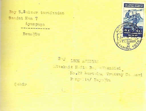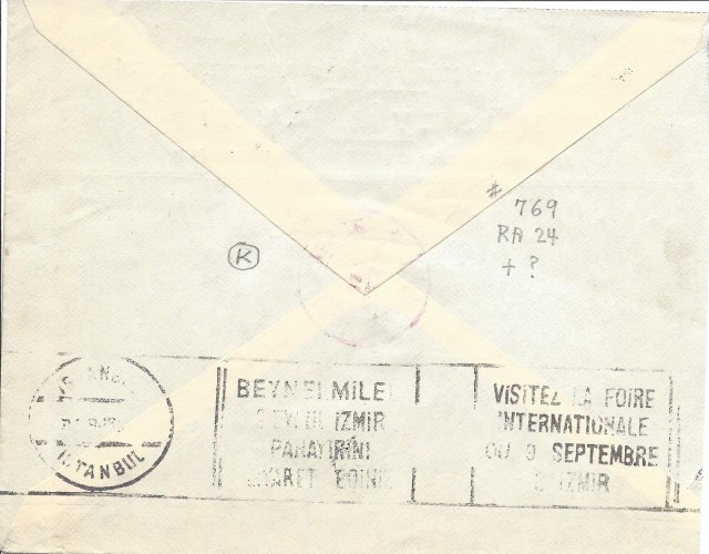 Bir diğer örnek Ankara’dan İstanbul’a gönderilen zarf, arka yüzdeki makine damgasında İzmir fuarı tanıtımı bulunuyor.