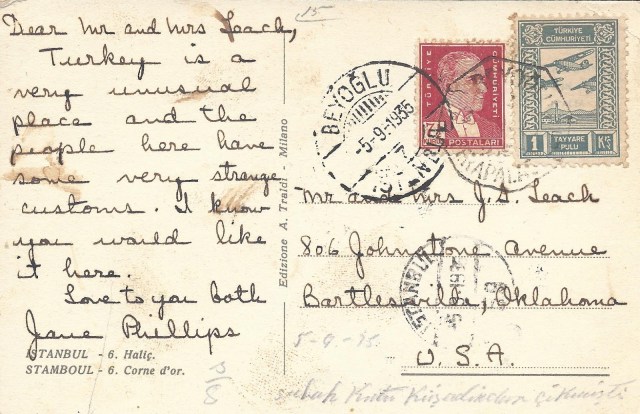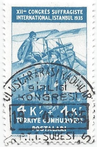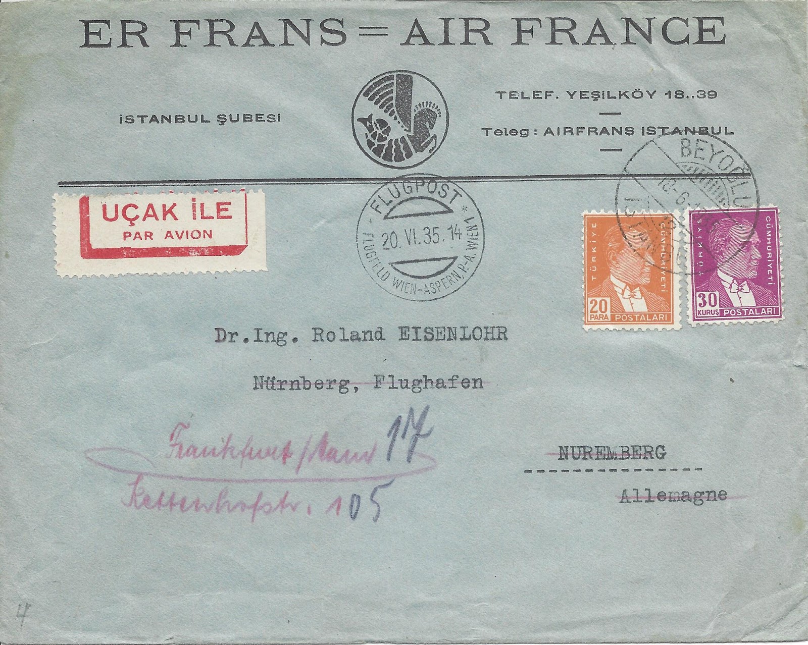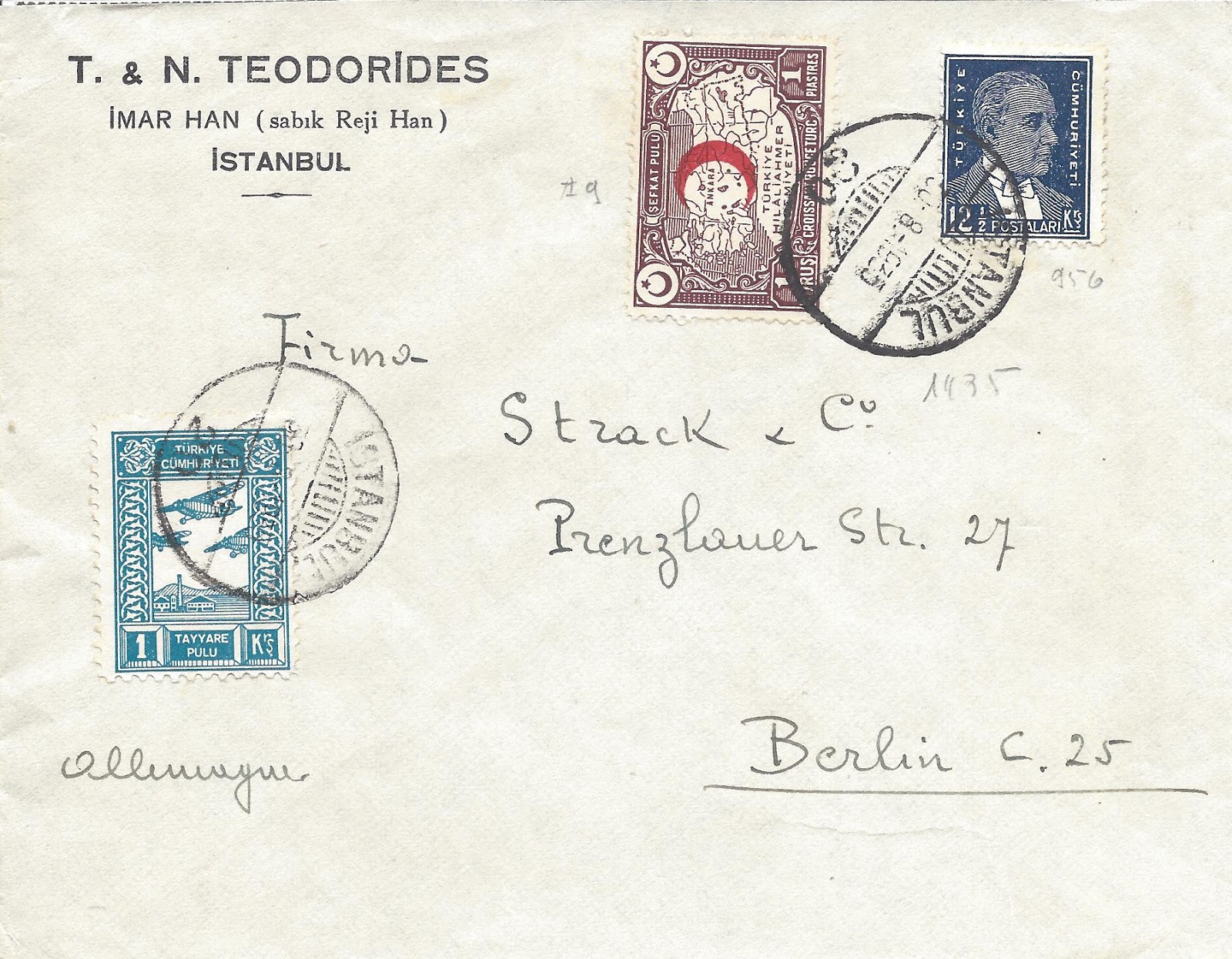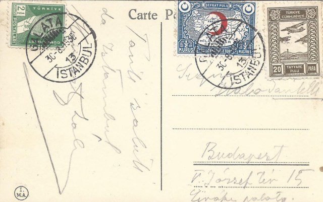 1934 yılında çıkarılan kanuna uygun olarak bastırılan uçak/tayyare pullarının postada ilk defa 1935 yılının 30 Ağustos bayramında kullanıldığını görüyoruz, ancak kataloglarda yanlış olarak pulların 1937 yılında çıktığı belirtilmektedir. Pera Palas oteli damgalı aşağıda görülen kart sokaklarda bulunan posta kutularından birine atılmış, Kızılay yardım pulu olmamasına karşın bayramdan sonra ABD’ye doğru yola çıkmış.