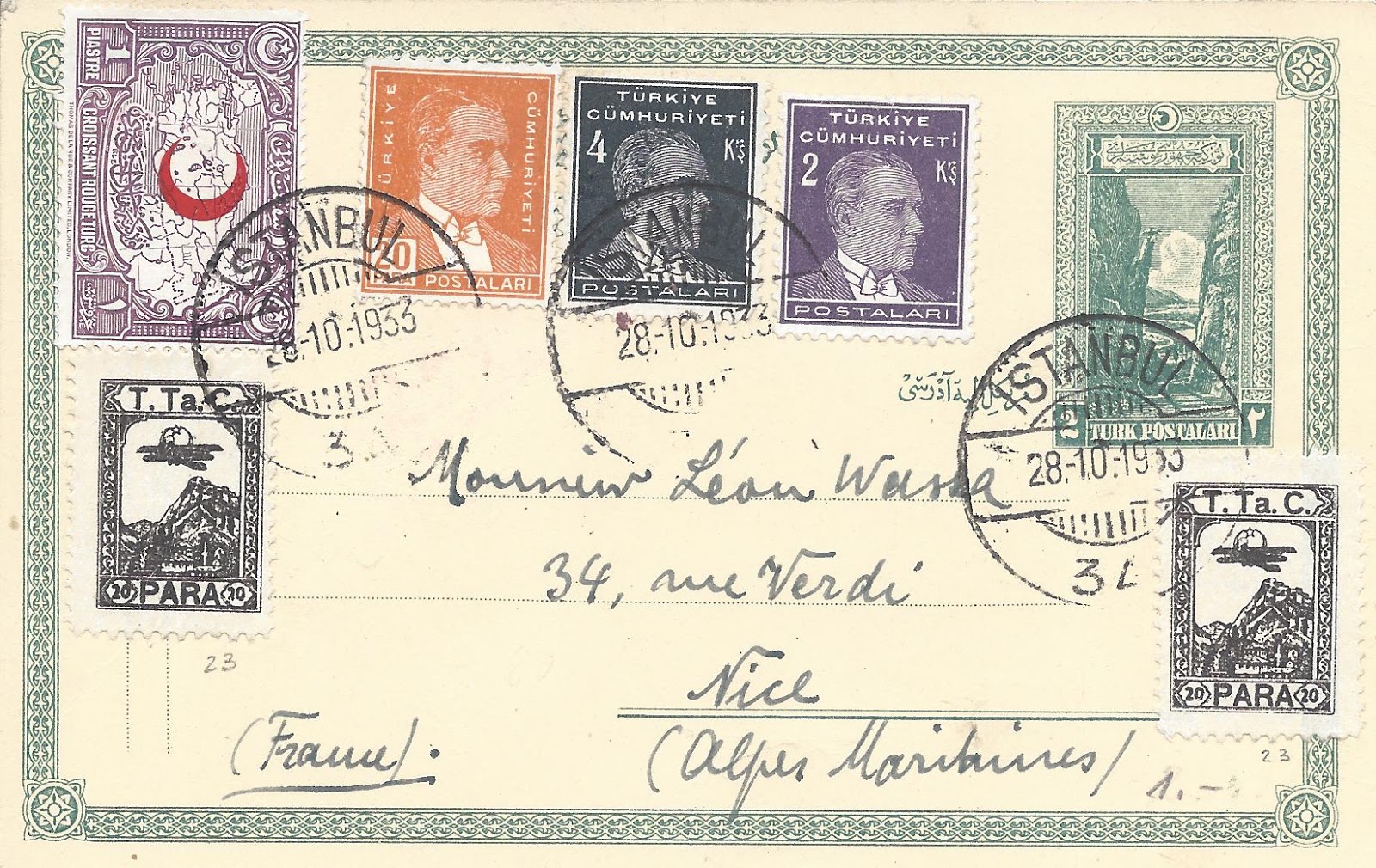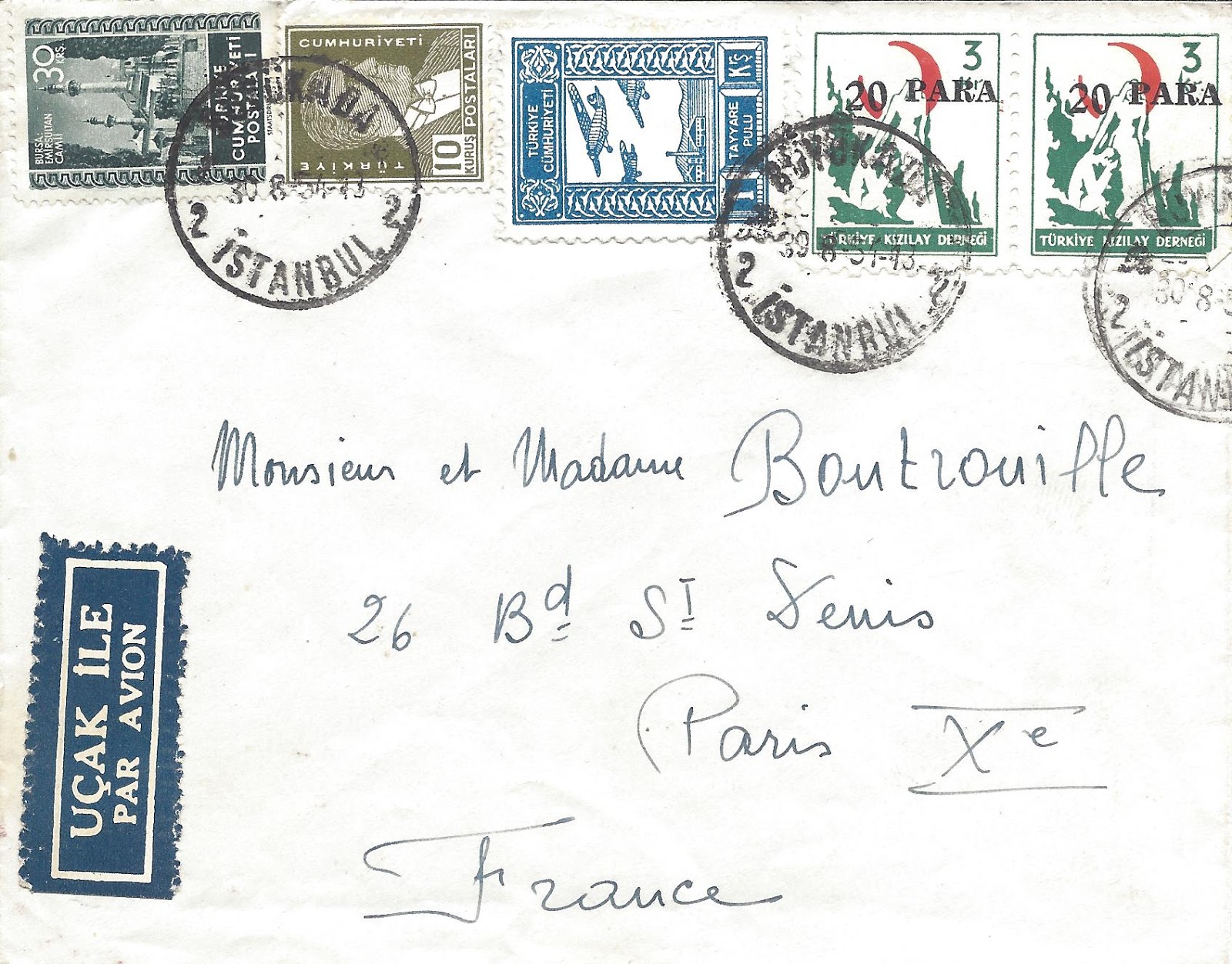 1958 yılında çıkarılan yasa ile kaldırılmasına kadar yirmi beş yıl devam eden uçak pulu uygulamasına, 30 Ağustos 1954 tarihli uçak postası ile gönderilmiş uçak harç pulu ve üstbaskılı kızılay yardım pulları kullanılmış bir örnek.