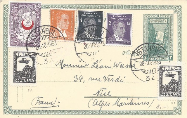 Aşağıdaki kartta, posta idaremizin 30 Ağustos Tayyare ve Zafer Bayramı ve 29 Ekim Egemenlik Bayramı haftalarında yaptığı yardım pulu uygulaması gereğince Kızılay ve Türk Hava Kurumu pulları yapıştırıldığını görüyoruz. 1933 yılına kadar yapılan bu uygulama 1934 yılında çıkarılan kanun ile değiştirildiği için cumhuriyetimizin onuncu yılı bu uygulamanın yapıldığı son yıl oldu.