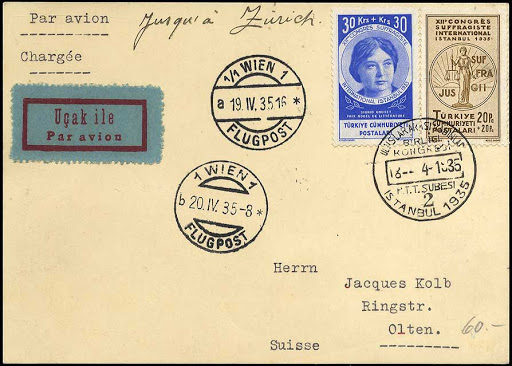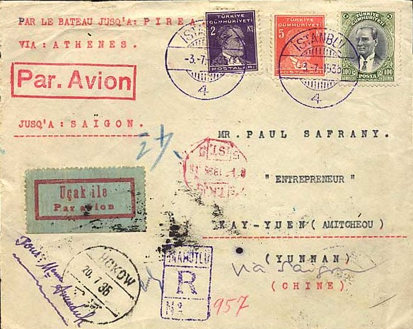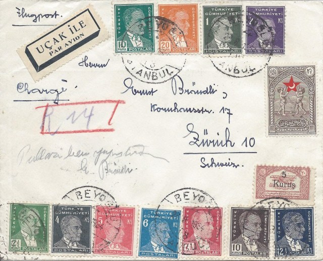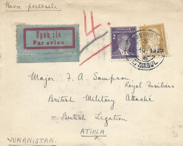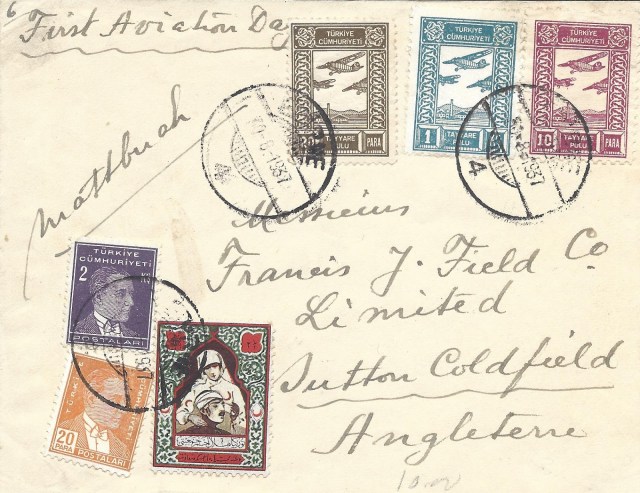 O dönemde uçak pulu toplamak oldukça popüler olduğu için bir tüccar tarafından yapılan filatelik zarfta uçak harç pulları serisinin en düşük değerli üç pulu olan on para (çeyrek kuruş), yirmi para (yarım kuruş) ve bir kuruşluk pulların üçü birden 30 Ağustos 1937 tarihli zarfa yapıştırılarak damgalanmış.