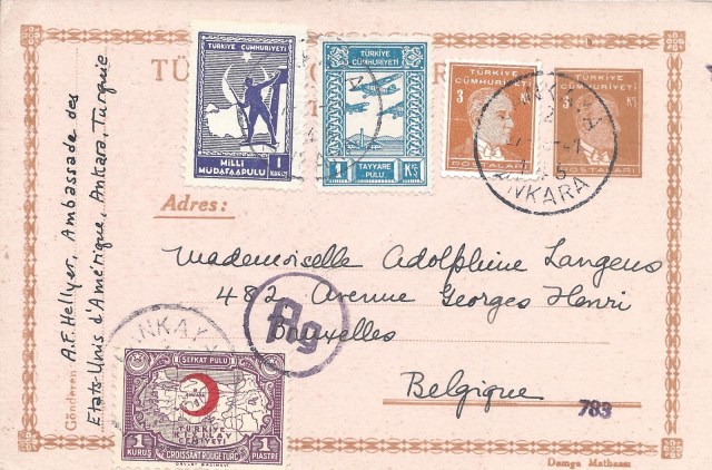 Dünya savaşının başlaması ile ulusal savunma (milli müdafaa) pulu uygulamasıda başlayınca yurtdışı kart için sadece altı kuruş posta pulu kullanılması gerekirken 30 Ağustos 1941 tarihli ABD elçiliğince gönderilen kartta bütün pulların toplamının dokuz kuruşa çıktığını görüyoruz. Kartta 20 para yerine bir kuruşluk uçak harç pulu kullanıldığı görülüyor.