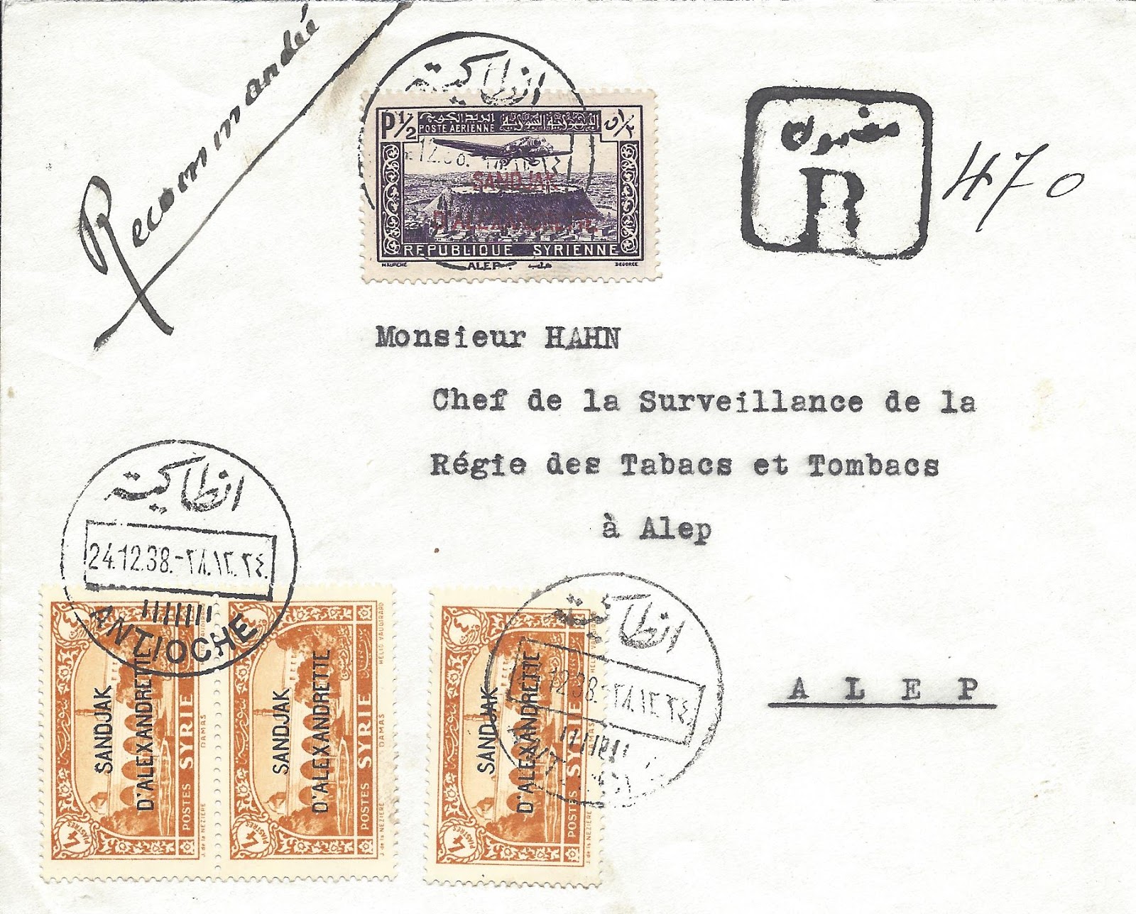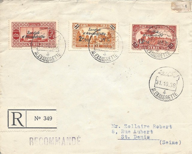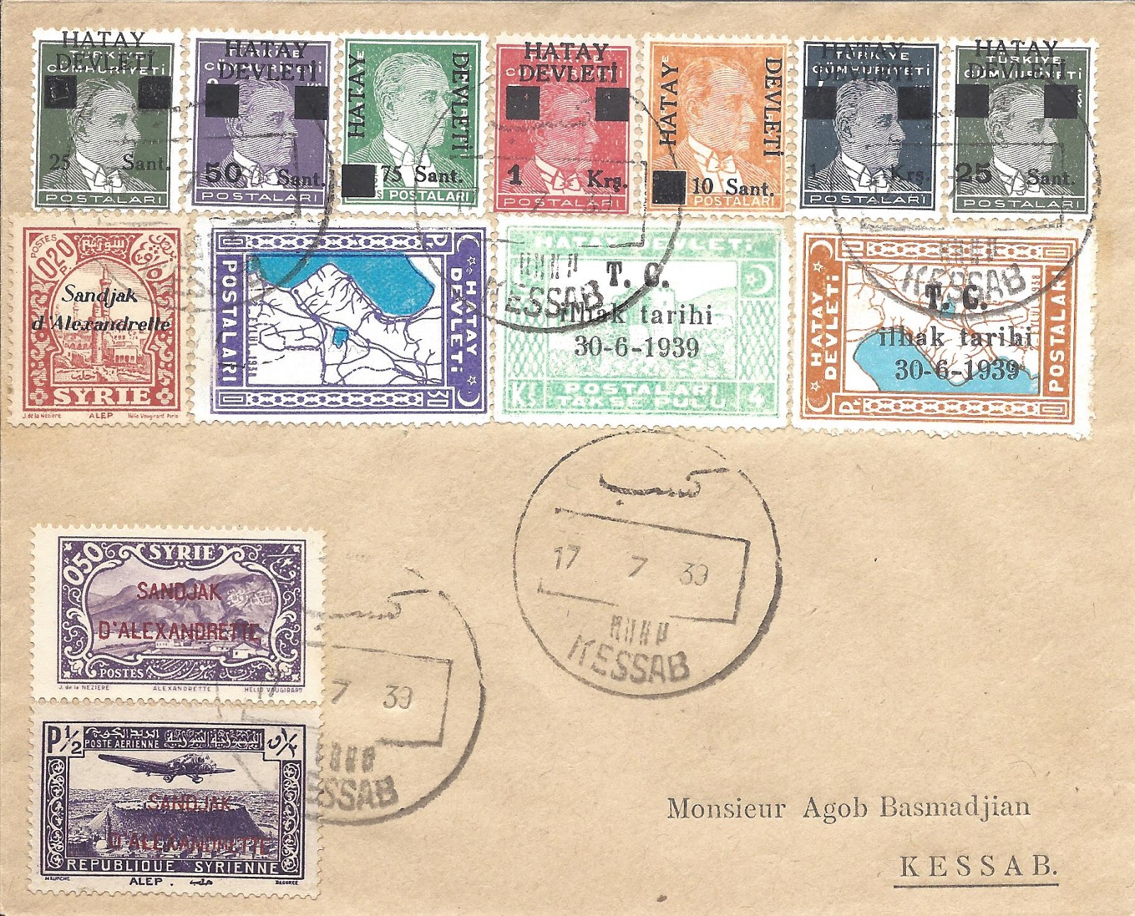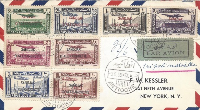 Tam seri uçak resimli pullar ile hazırlanan 9 Mayıs 1938 Antioche (Antakya) damgalı zarf uçak postası ile Trablusşark – Marsilya yolu ile Amerika Birleşik Devletlerine gönderilmiş.