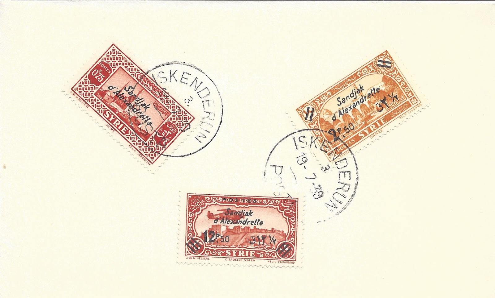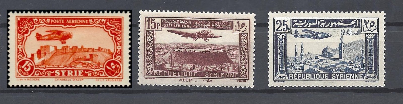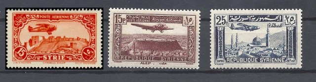 Altta Suriye posta idaresi tarafından bastırılan daha sonra Hatay Devleti tarafından üzerine üstbaskı yapılarak kullanılan uçak resimli pullardan bazıları görülmektedir. İlki 1931, ikincisi 1937 yıllarında bastırılan pullarda Halep kalesi üzerinde uçan uçaklar yine 1937 yılında bastırılan üçüncü pulda ise Şam şehrinde Emevi Camisi üzerinde uçan bir uçak bulunmaktadır.