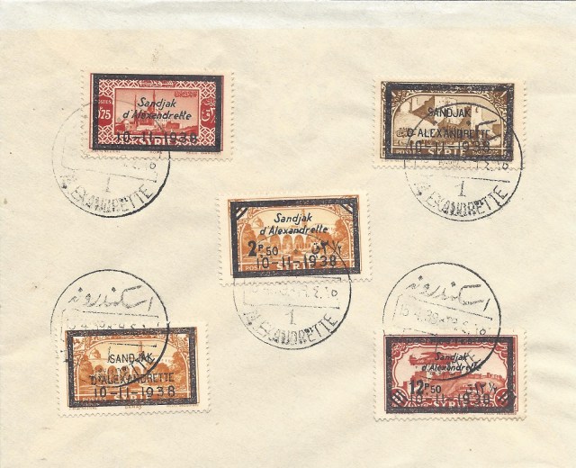 Hatay Devleti Uçak resimli pul serisinin çıkış tarihi kataloglarda 15 Nisan 1938 olarak verilmektedir, aşağıda bulunan tam seri pullar ile hatıra amacı ile hazırlanan zarf 16 Mayıs 1938 Alexandrette (İskenderun) damgalı.