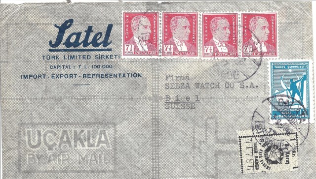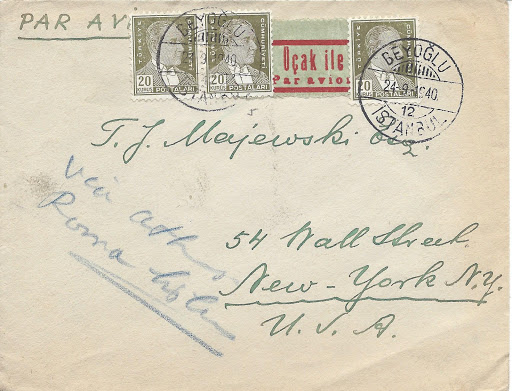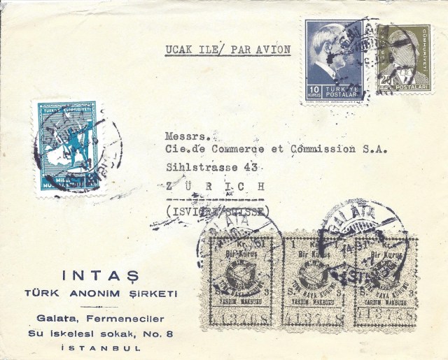 Aşağıda görülen 1946 tarihli üç Galata damgalı zarfta da tayyare pulu yerine THK yardım makbuzlarının hemde Galata postanesi gibi bir postanede kullanılmış olması ilgi çekici.