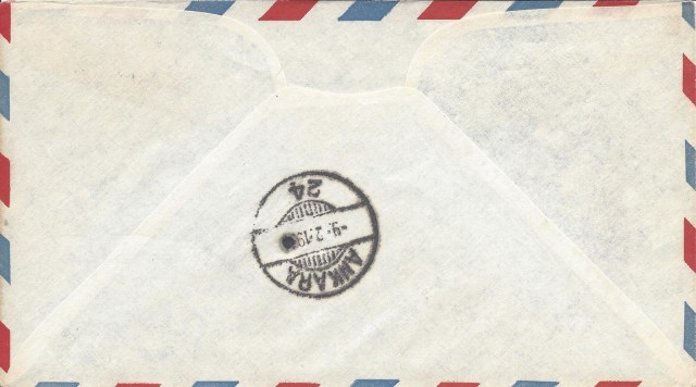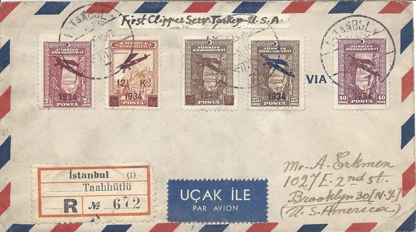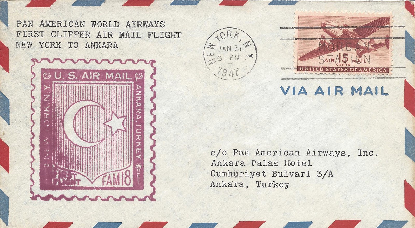 Bu ilk uçuş ile Amerika Birleşik Devletlerinden ülkemize gelen bir başka ilk uçuş zarfını altta görebilirsiniz. 31 Ocak 1947 tarihinde New York şehrinden gönderilen zarf ancak 9 Şubat 1947 tarihinde Ankara’ya ulaşabilmiş, çünkü Ankara havaalanı kar nedeni ile kapalı olduğundan uçak pas geçerek Şam’a gitmek zorunda kalmış.