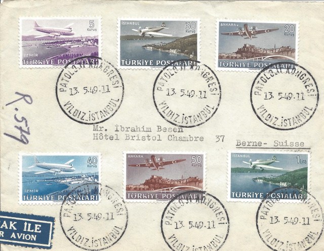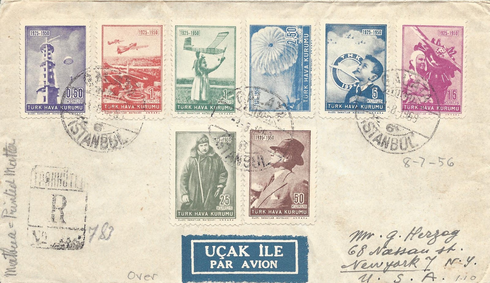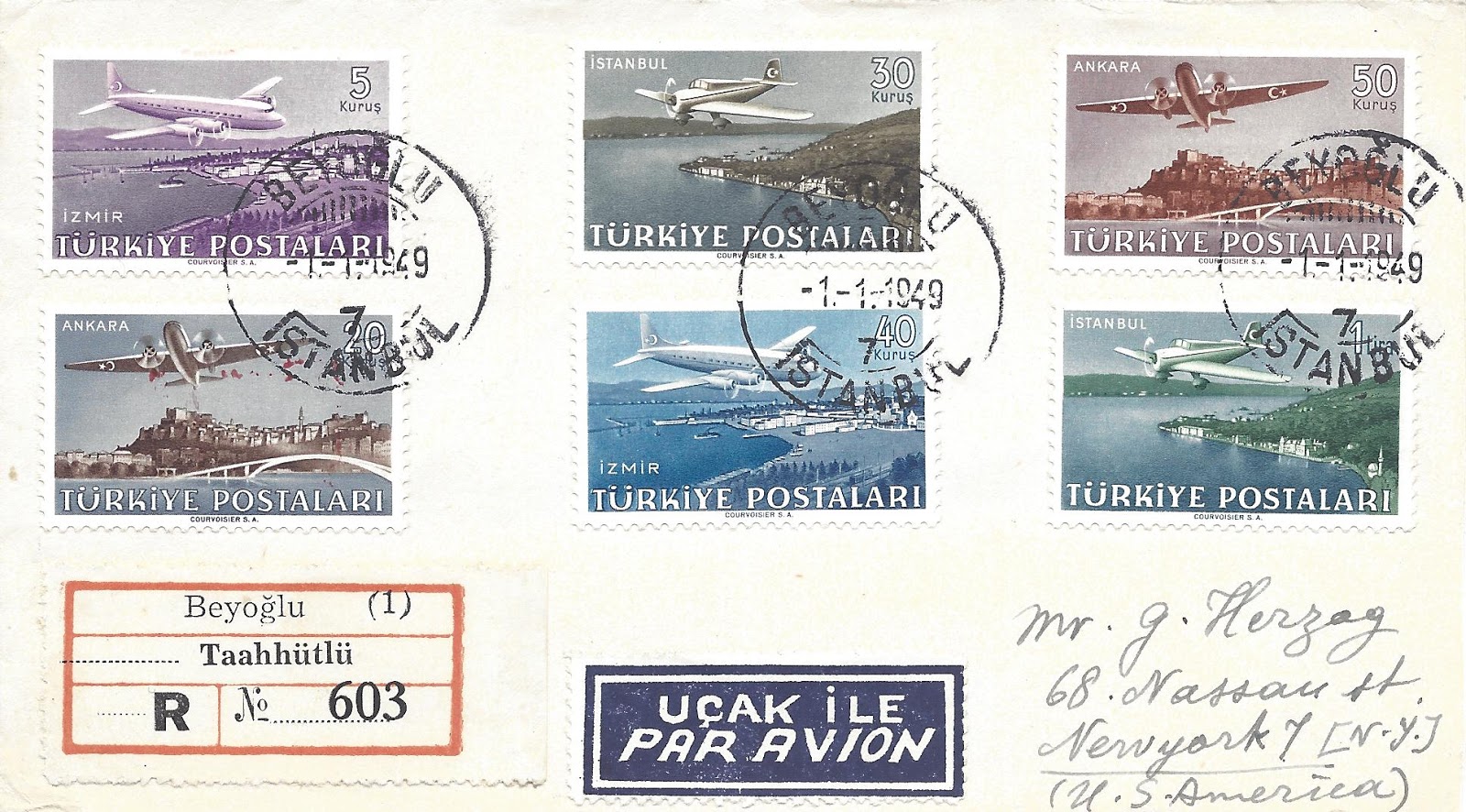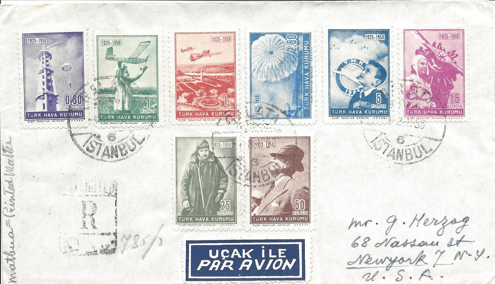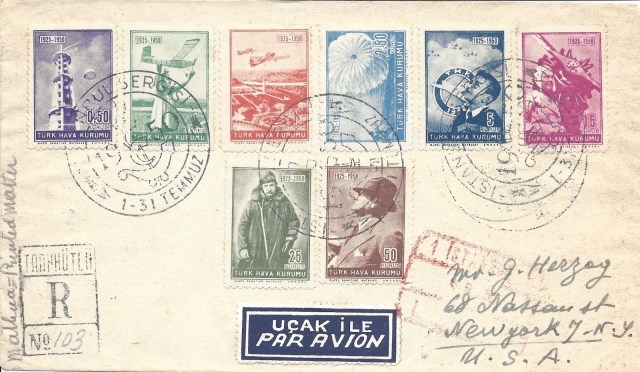 Koleksiyonumdan 1949 uçak pulu serisi kullanılan bazı zarfları paylaşmak istiyorum, bunlardan ilki tam seri pullar ile hazırlanarak ilk gün taahütlü olarak Amerika Birleşik Devletleri’ne dönemin önemli aerofilateli tüccarı George Herzog’a gönderilmiş.