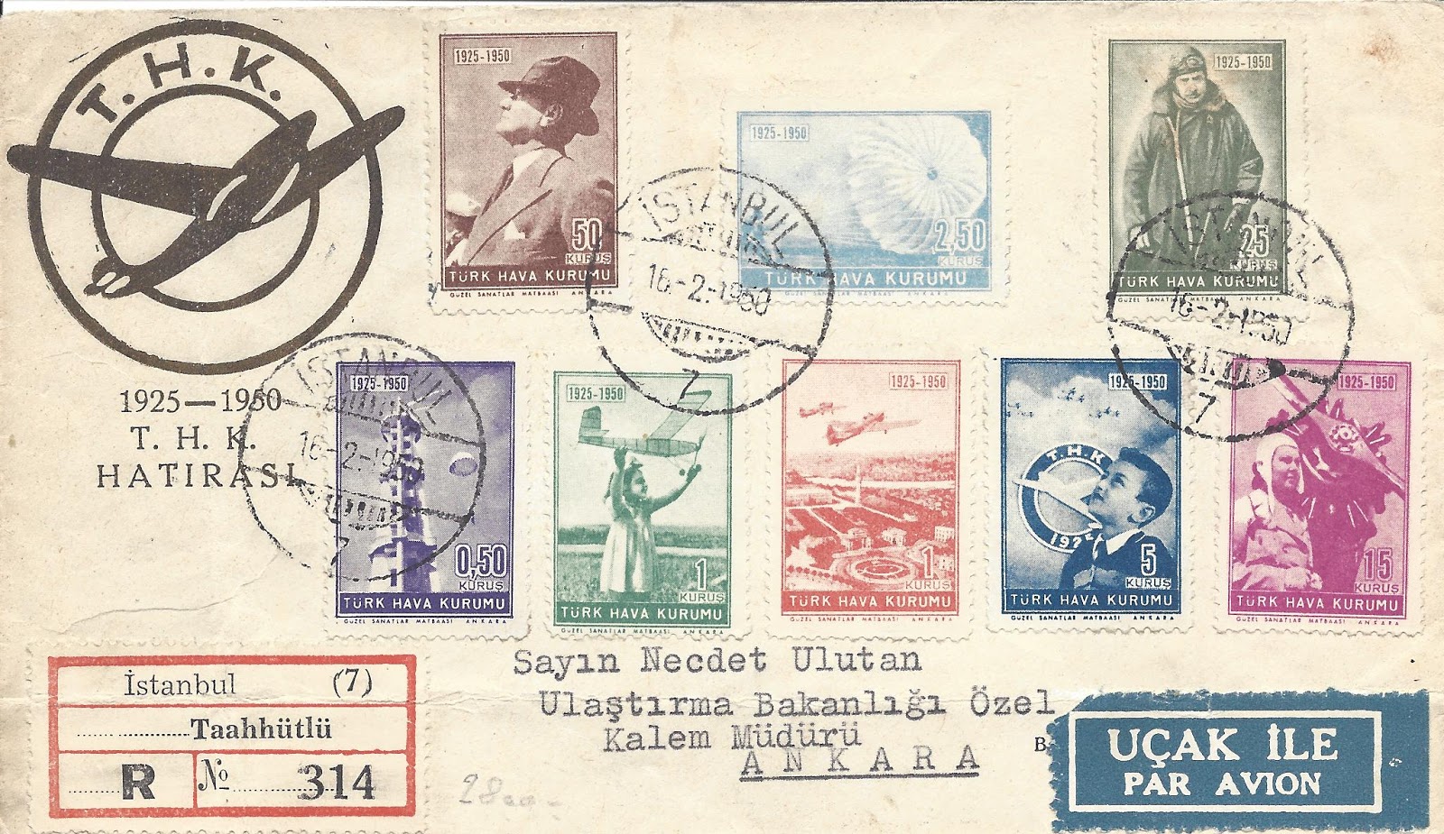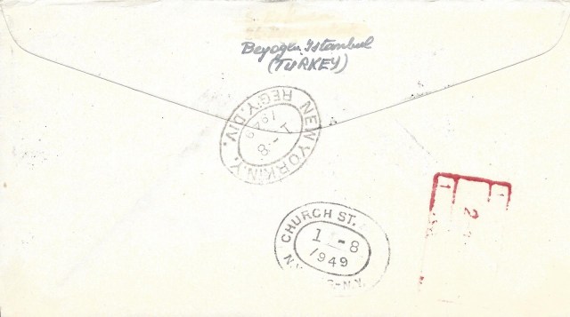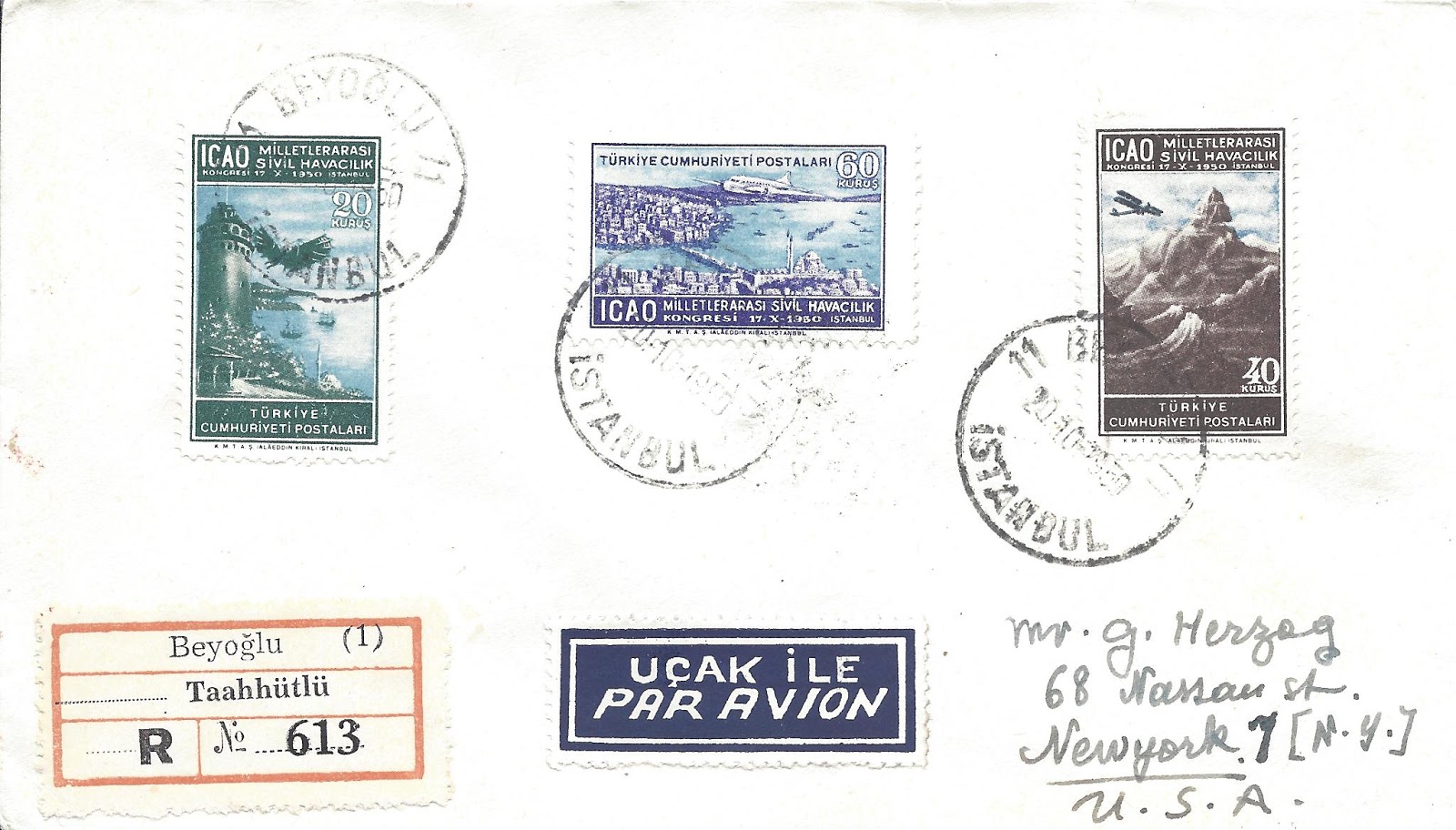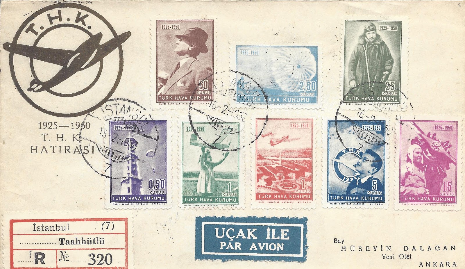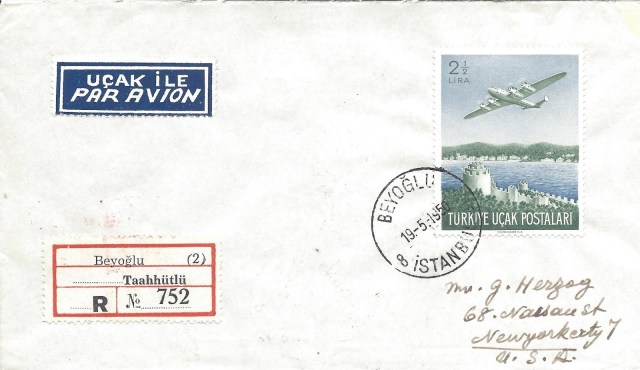 Koleksiyonumdan 1949 uçak pulu serisi kullanılan bazı zarfları paylaşmak istiyorum, bunlardan ilki tam seri pullar ile hazırlanarak ilk gün taahütlü olarak Amerika Birleşik Devletleri’ne dönemin önemli aerofilateli tüccarı George Herzog’a gönderilmiş.