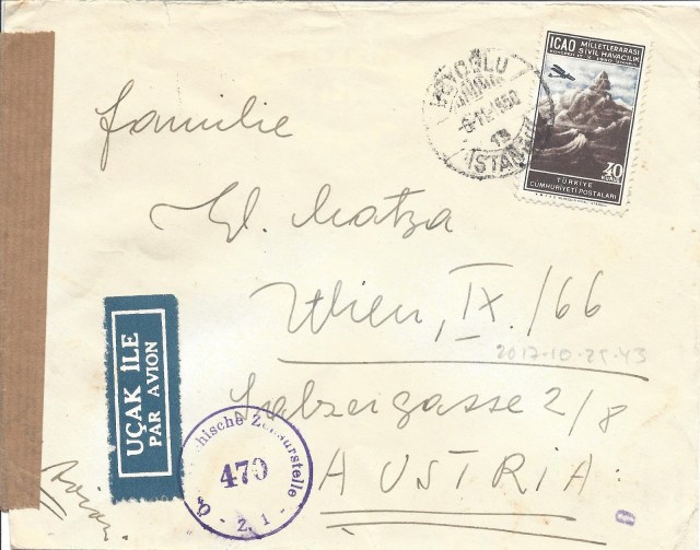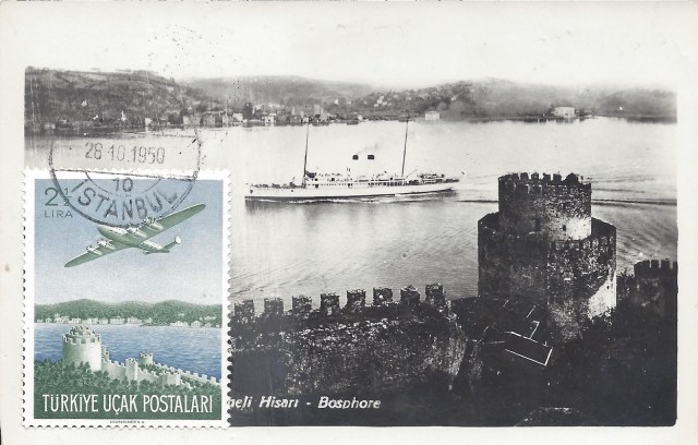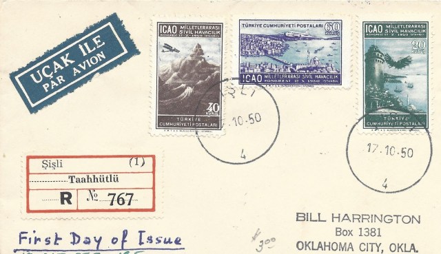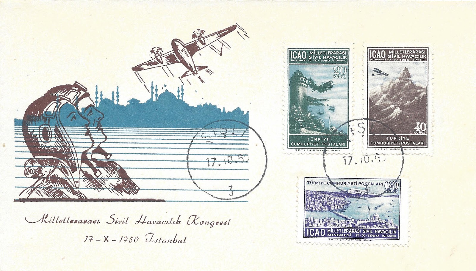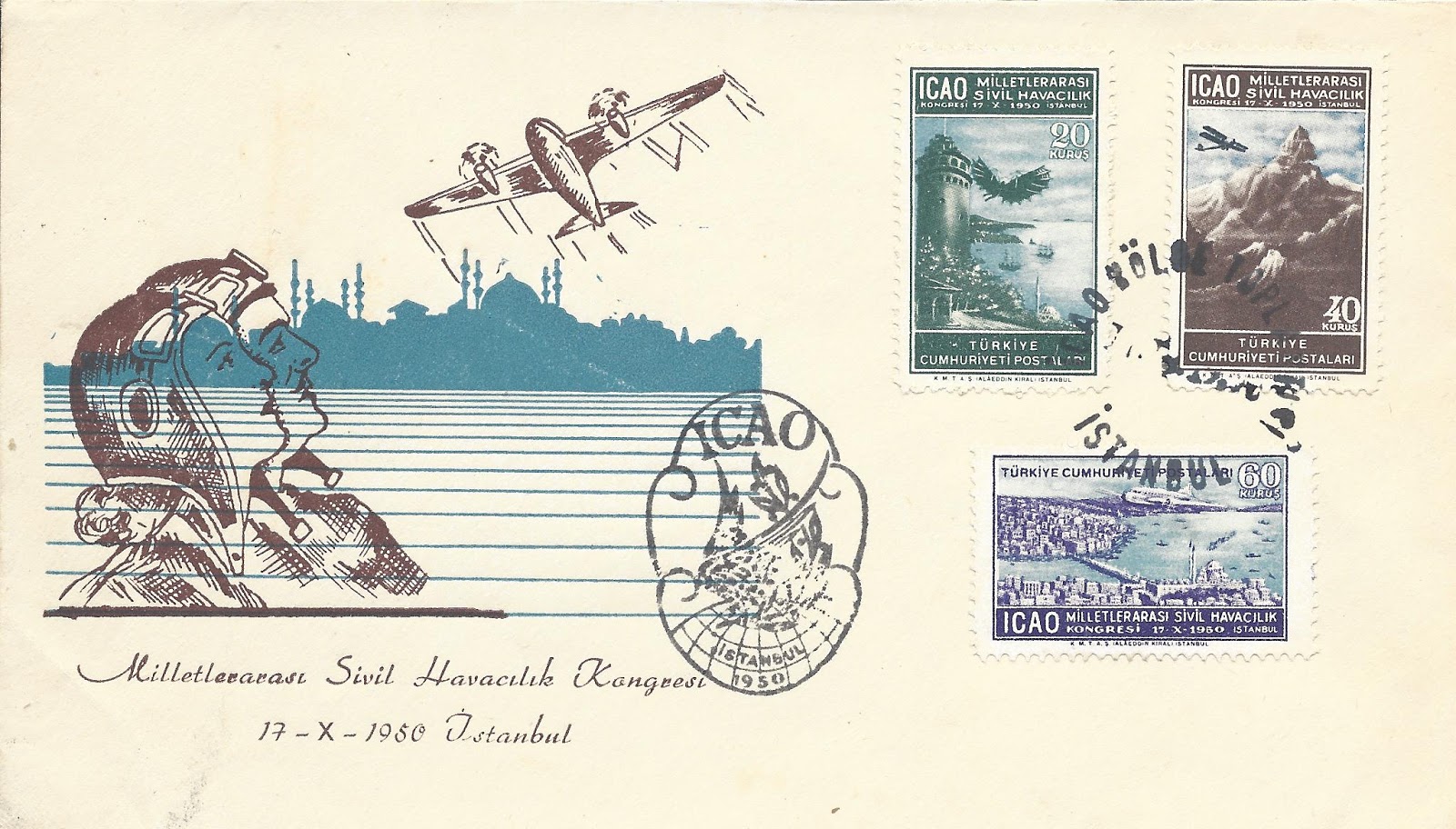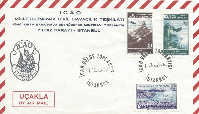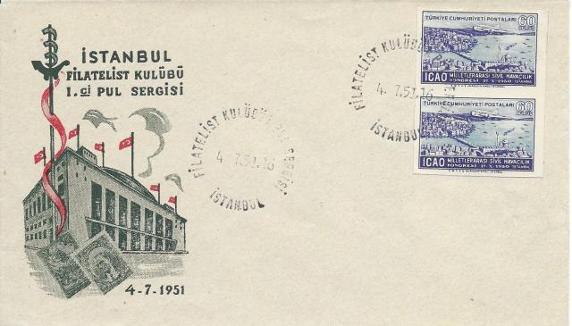 İstanbul Filatelist Klubü tarafından1951 yılında ilk defa düzenlenen pul sergisi sırasında açılan geçici postahanede hatıra olarak damgalanan aşağıdaki zarfta ICAO toplantısı anma serisinden altmış kuruşluk pulun dantelsiz per/çift olarak kullanıldığı görülmektedir.