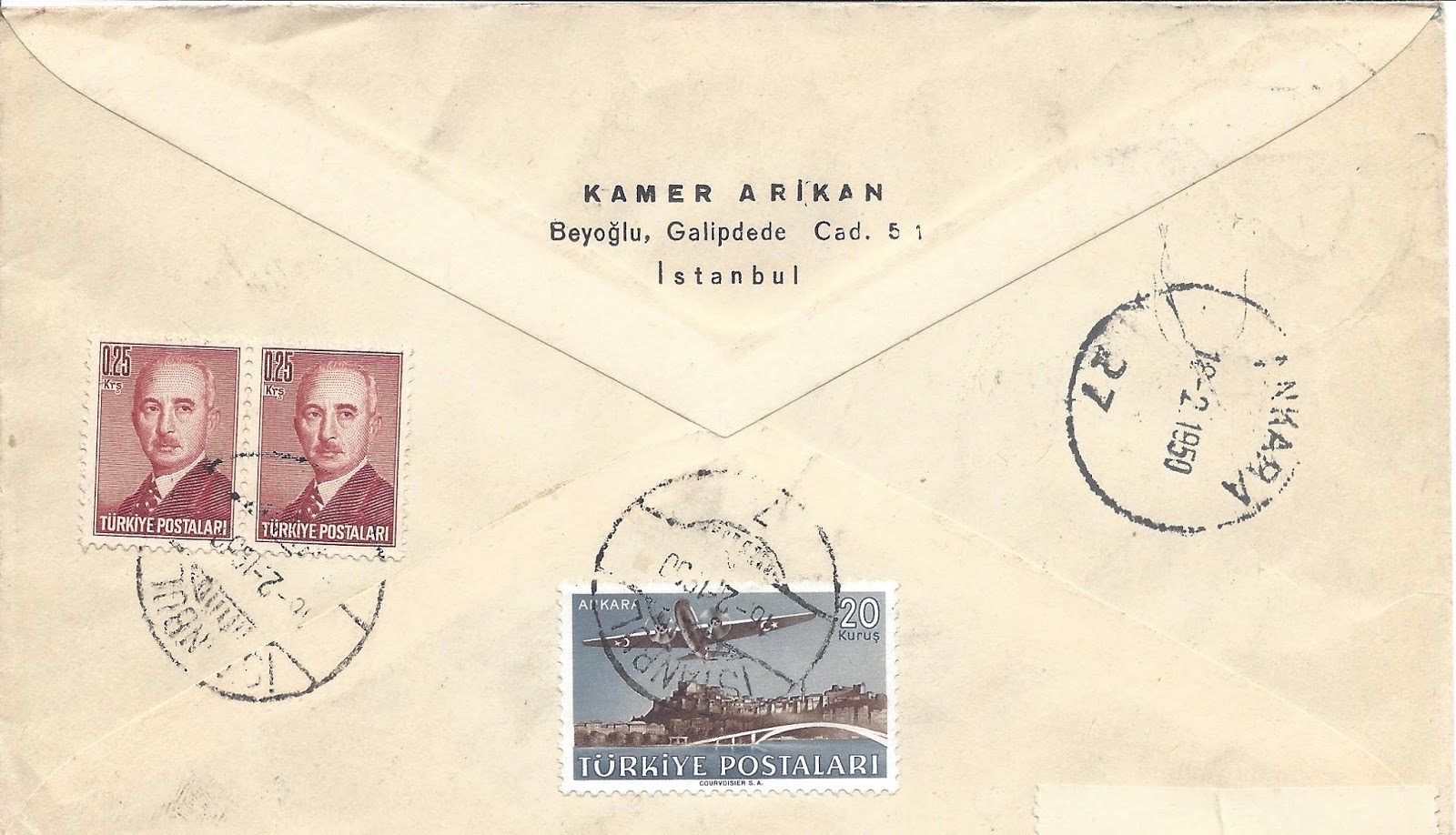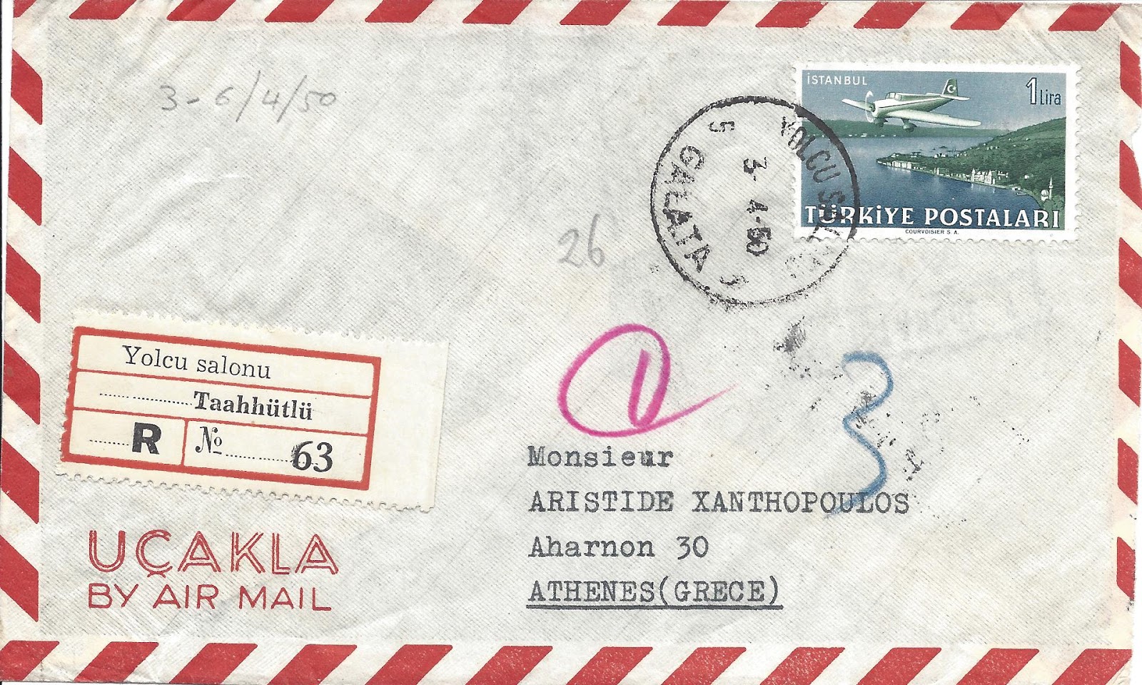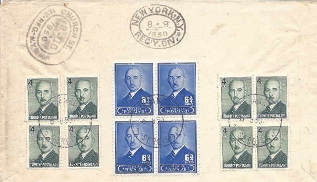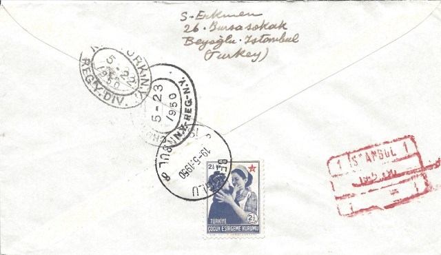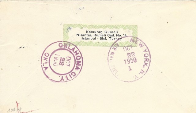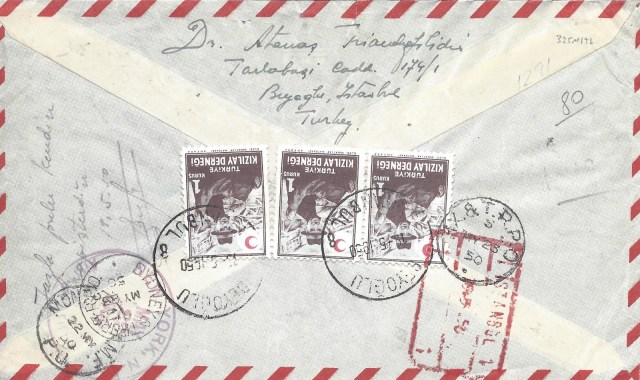 Serinin en yüksek valörü olan bir liralık pul kullanılarak hazırlanan zarf hava postası ile taahütlü olarak Yunanistan’ın Atina şehrine gitmiş. 3 Nisan 1950 tarihinde İstanbul’dan yola çıkan zarf ancak 6 Nisan 1950 tarihinde Atina’ya ulaşmış görünüyor.