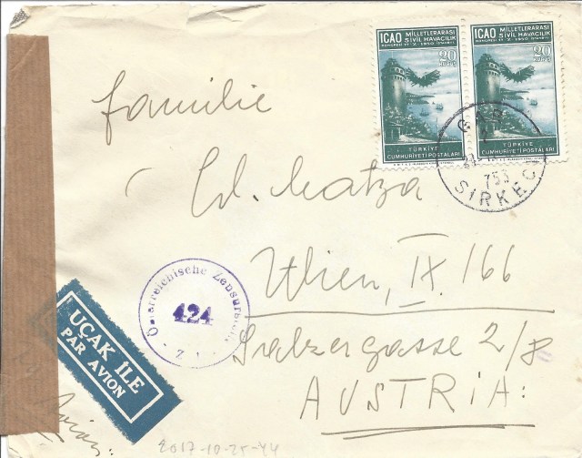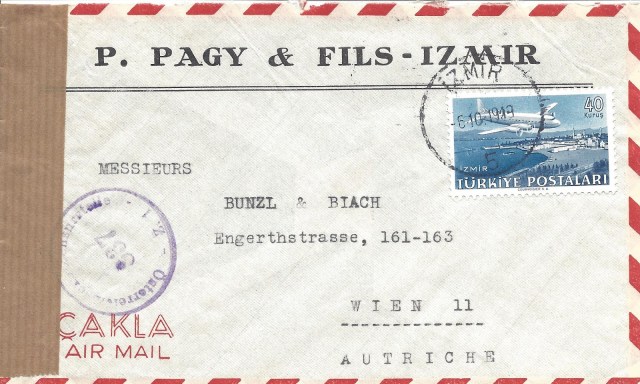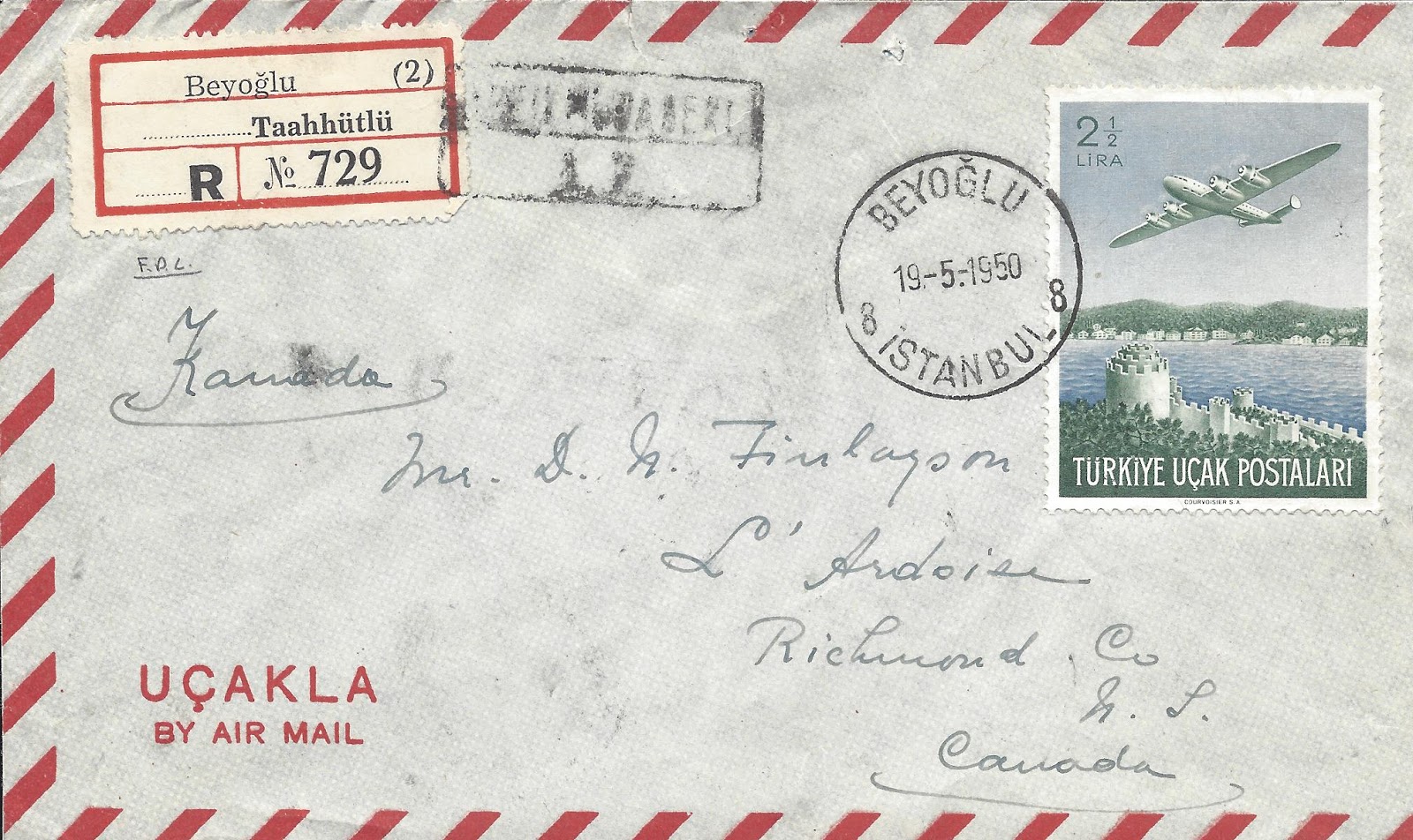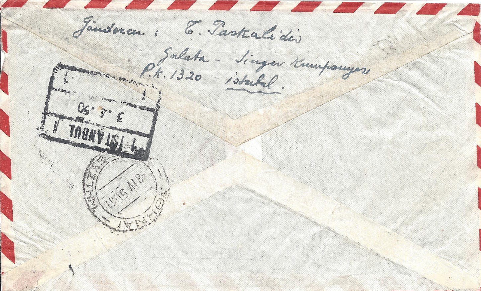 Serinin en yüksek valörü olan bir liralık pul kullanılarak hazırlanan zarf hava postası ile taahütlü olarak Yunanistan’ın Atina şehrine gitmiş. 3 Nisan 1950 tarihinde İstanbul’dan yola çıkan zarf ancak 6 Nisan 1950 tarihinde Atina’ya ulaşmış görünüyor.