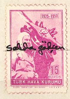 Son olarak Pilot Binbaşı Sabiha Gökçen tarafından imzalanmış kendi fotoğrafı bulunan pul altta görülmektedir.