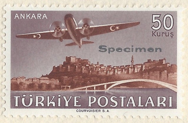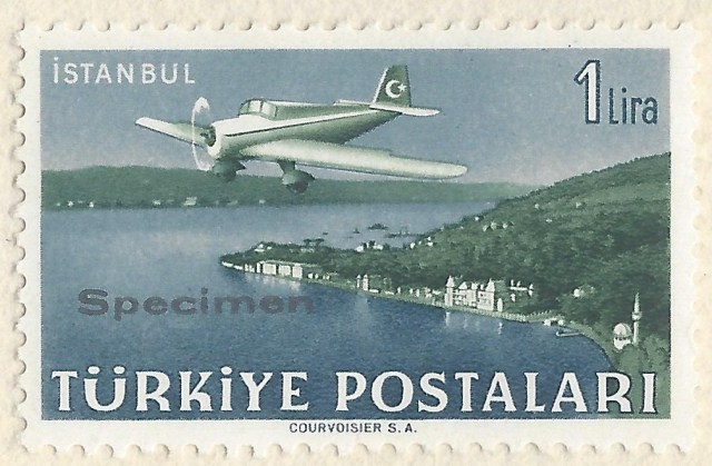Daha önceki yazılarımda 1934 yılında ve sonraki yıllarda üstbaskı yapılarak hazırlanan uçak pulu serileri ile Kadınlar Birliği Kongresi ve Cumhuriyetimizin yıldönümlerinde basılan bazı serilerde bulunan uçak resimli pullar hakkında detaylı bilgiler vermiştim. Bu yazının konusu ise 1949 yılında satışa sunulan. üstat Ali Nusret Pulhan’ın sözleriyle “ilk defa olarak sürşarjsız ve çok güzel bir uçak serisi Courvoisier matbaasında bastırılarak 1-1-1949 tarihinde tedavüle çıkarılmıştır. Ankara, İstanbul ve İzmir’in havadan görünen manzaraları ile süslenen bu pullar güzel serilerimizden birini teşkil etmektedir (oluşturmaktadır).” uçak pulları serimizdir. Güzel pul serilerimizden bazılarını basan İsv.çre’de bulunan Courvoisier matbaası bu seri için de özel bir örnek pullar portföyü hazırlamıştır, altta bu portföyde bulunan üzerinde specimen/örnek üstbaskısı bulunan pullardan bazıları bulunmaktadır.
