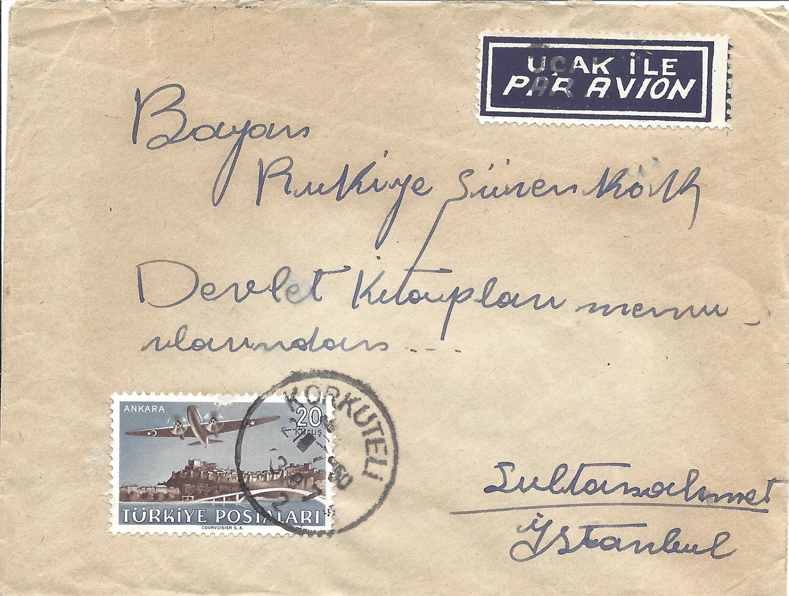 Serinin 20 kuruşluk pulu ile Antalya Korkuteli’den hava postası ile İstanbul’a uçmuş bir zarf.