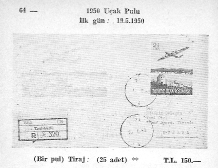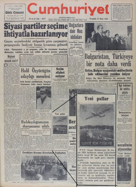 Savaş sonrası uçak seferlerinin sürekli ve düzenli hale gelmesi ve uluslararası ticaretin hızla canlanması ile uçak postası kullanımı artmaya başladı. 1947 yılında yeniden düzenlenen posta tarifelerinde uçak postası tarifelerinin karmaşık bir hale geldiğini görüyoruz. Yüksek hava postası ücretleri nedeni ile bu ücretleri ödemek için yüksek değerde pullara gereksinim ortaya çıktı. Posta idaremiz alışılagelmiş tarifeye göre pul basma uygulamasının dışına çıkarak iki buçuk lira değerde bir pul çıkardı. Aşağıda görülen 27 Nisan 1950 tarihli gazetede bu pulun çıkışı ile ilgili haber gazetenin ön sayfasında yer almaktadır.
