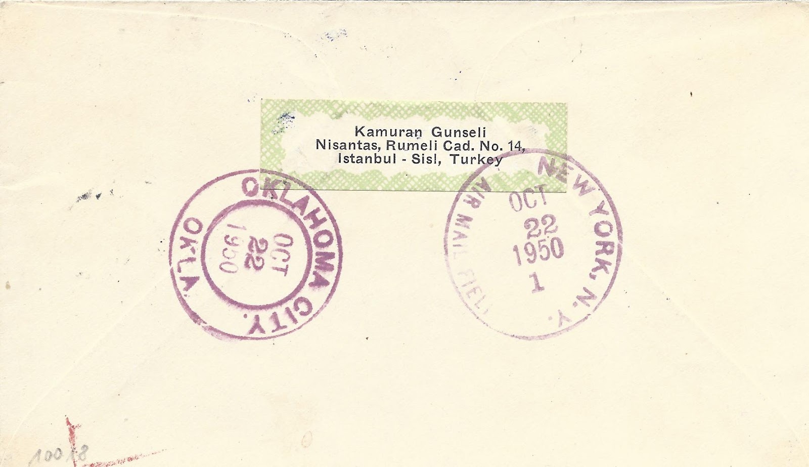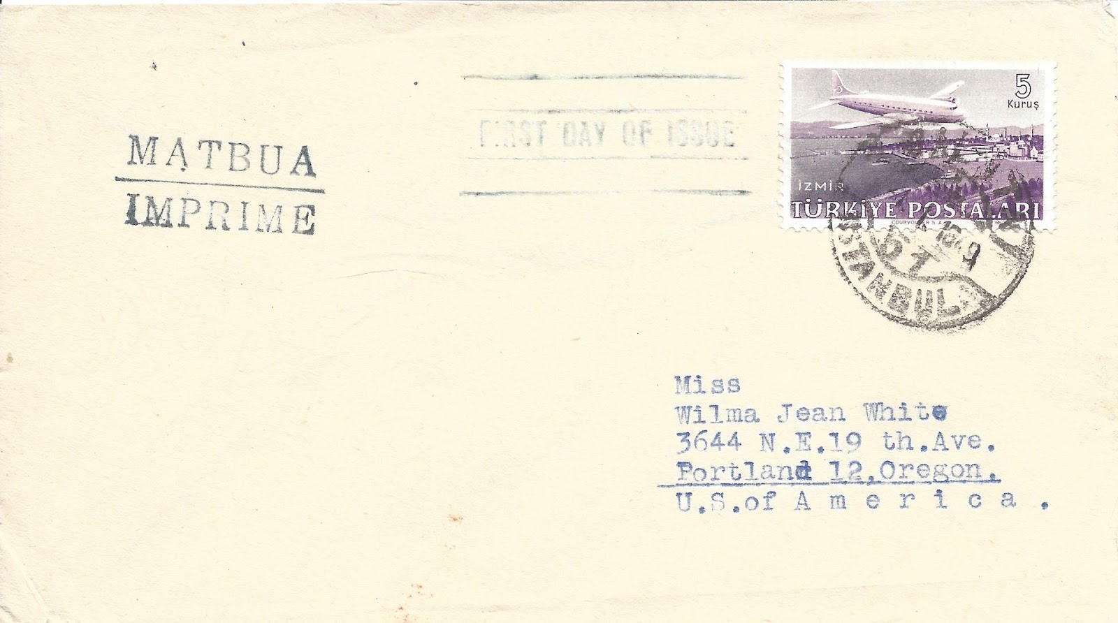 Altta bulunan zarf en küçük valör olan beş kuruş pul ile hazırlanarak basılı kağıt için özel indirimli tarife ile ABD’ye dönemin ilk gün zarfları koleksiyoncusu Wilma Jean White’a gönderilmiş.