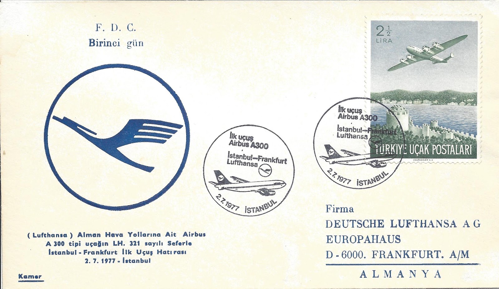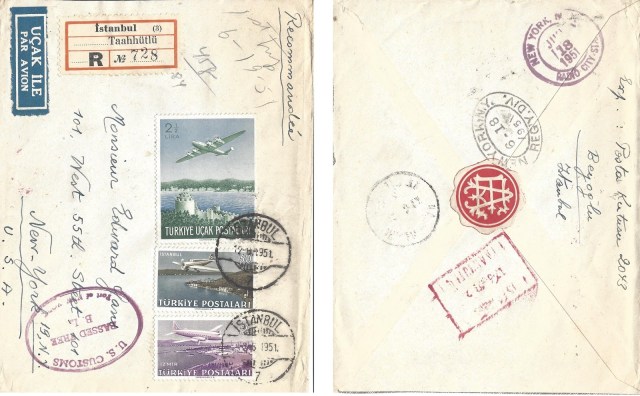 Altta bulunan zarf o dönemlerde Temmuz ayı süresince Küçükçiftlik parkında kurulan İstanbul Sergisinde posta idaremizin açtığı geçici postahaneden Amerika Birleşik Devletleri’nin önemli aerofilateli tüccarı George Herzog’a gönderilmiş. Önde bulunan Türk Hava Kurumu yardım pulları ve arkada bulunan posta pulları serginin farklı damgaları ile damgalanmış.