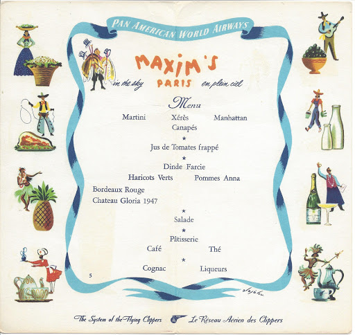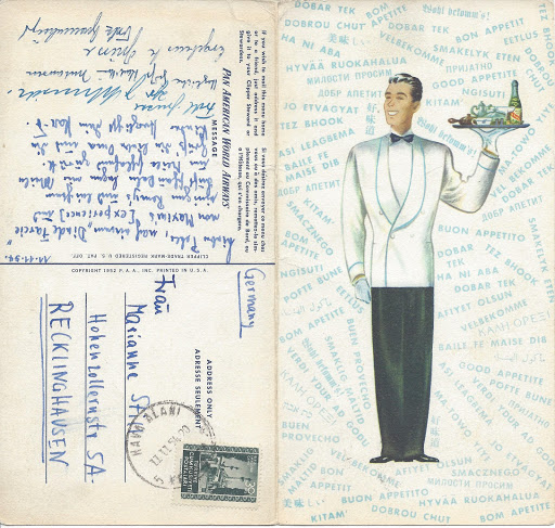 Yukarda Pan Amerikan Havayollarının seferleri sırasında yolcularına verdiği yemeklerden birine ait menu, kartpostal olarak Yeşilköy havaalanından postaya verilmiş.