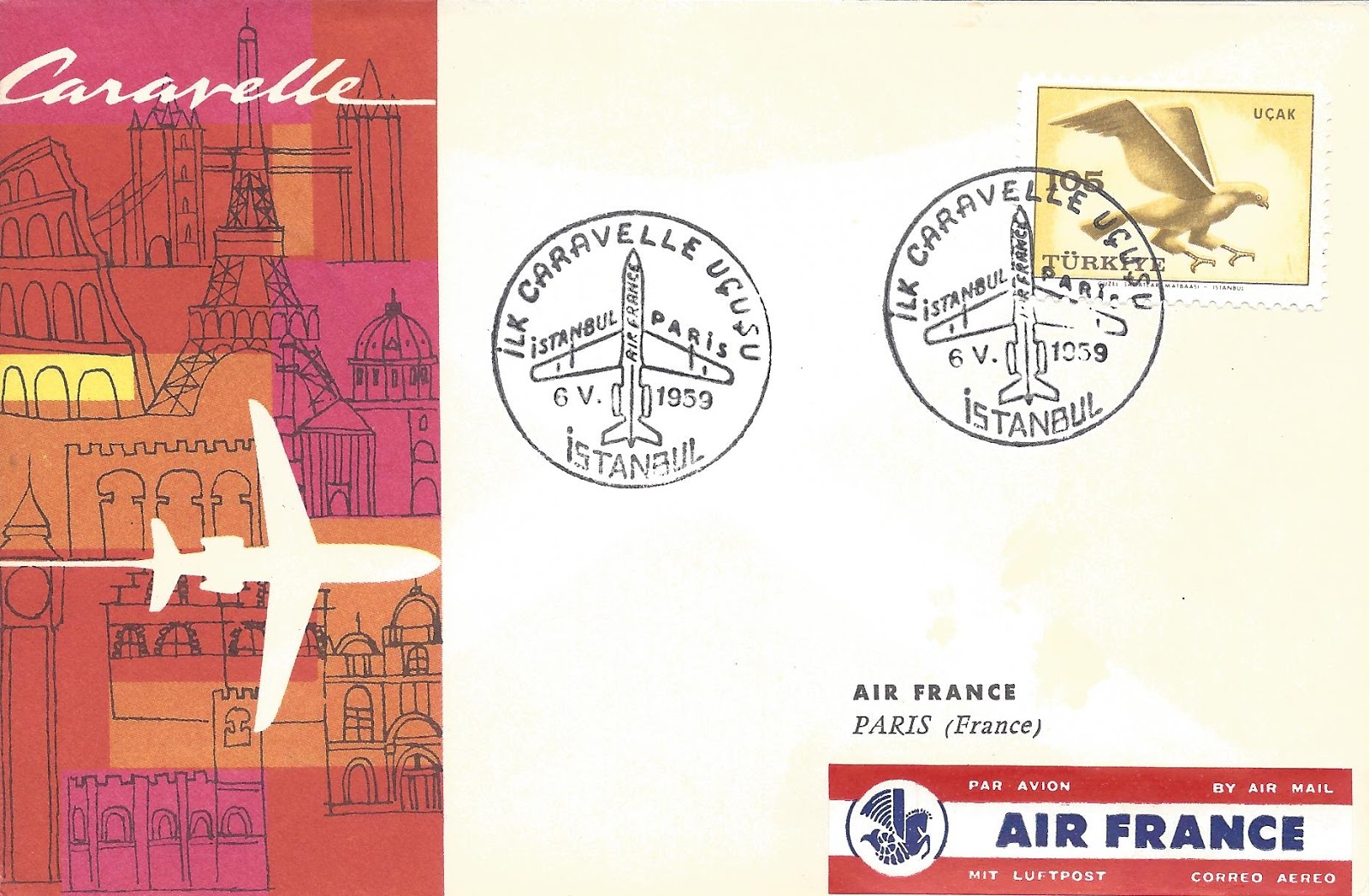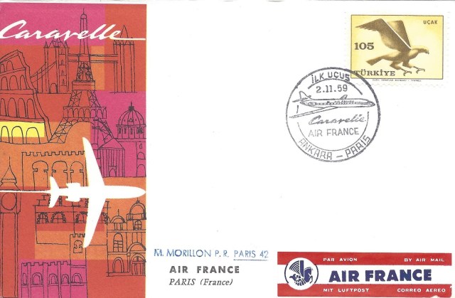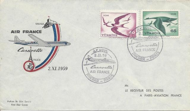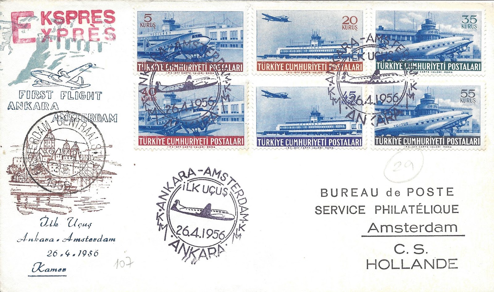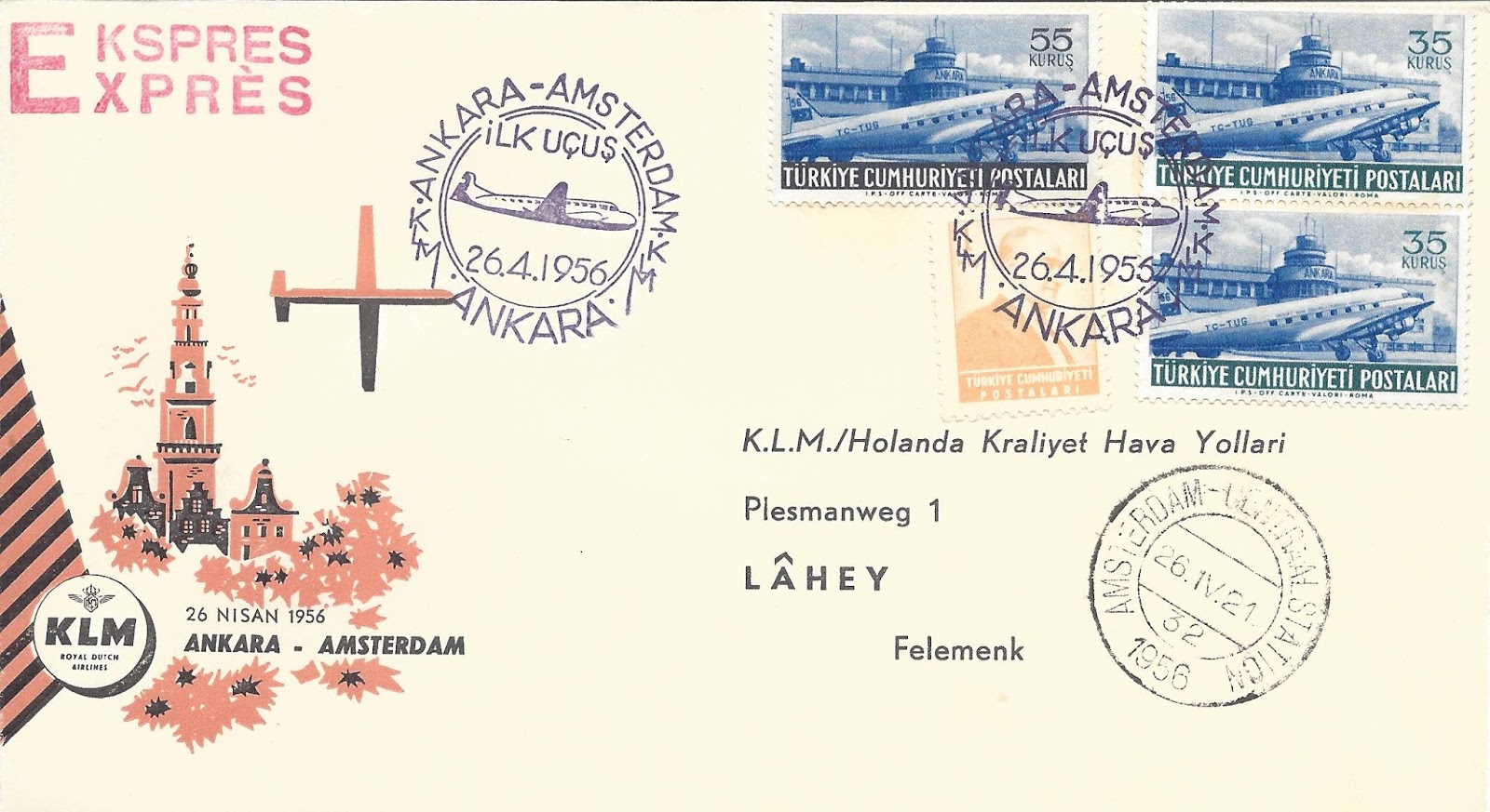 Altta 1954 uçak posta pulları serisi tam seri olarak kullanılarak hazırlanmış, Ankara-Amsterdam uçuşunda 26 Nisan 1956 tarihinde posta idaremizin özel uçuş damgası kullanılan, pul tüccarı Kamer Arıkan tarafından hazırlanan bir uçuş zarfı görülmektedir. Hemen altında görülen zarf ise KLM tarafından hazırlanan aynı özel damga ile damgalanmış bir uçuş zarfı, KLM bu zarfın benzerini Amsterdam-Ankara uçuşu içinde yapmıştır.