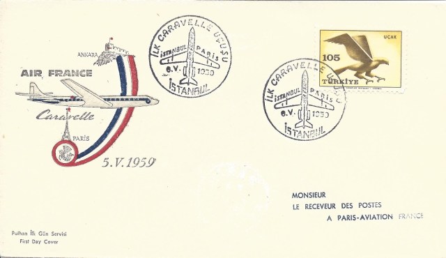 AEI tarafından tek bir defa gerçekleştirilen İstanbul-Roma uçuşu anısına posta idaremiz 1 Temmuz 1933 tarihinde özel bir damga kullanan posta idaremiz, belkide damga kullanmak isteyenlerin son derece az sayıda olması nedeni ile daha sonra uzunca bir süre hiçbir uçuş için özel damga hazırlamamıştır. Daha önceki birkaç yazımda anlatıldığı gibi savaş sonrası dönemde uçak şirketlerinin kendi uçuşları için posta damgalı da olsa uçuş zarfları hazırlamaya başladığını görünce ilk olarak 26 Nisan 1956 tarihinde Hollanda hava yolları şirketi KLM’nin gerçekleştirdiği Amsterdam-Ankara-Amsterdam uçuşu için özel bir uçuş damgası hazırladığını görüyoruz. Daha sonra bu tip özel damgaların çeşitli uçak şirketlerinin ilk uçuşları için hazırlanmış ve bu özel damgalar ile gerek uçak şirketleri, gerek ülkemizdeki pul tüccarları, gerek yurt dışındaki pul tüccarları tarafından gerekse bireysel olarak ilk uçuş zarfları yapılmaya başlanmıştır. Posta idaremizin özel damga hazırlamadığı uçuşlar içinde uçuş zarfları yapmaya devam edenler de olmuştur.