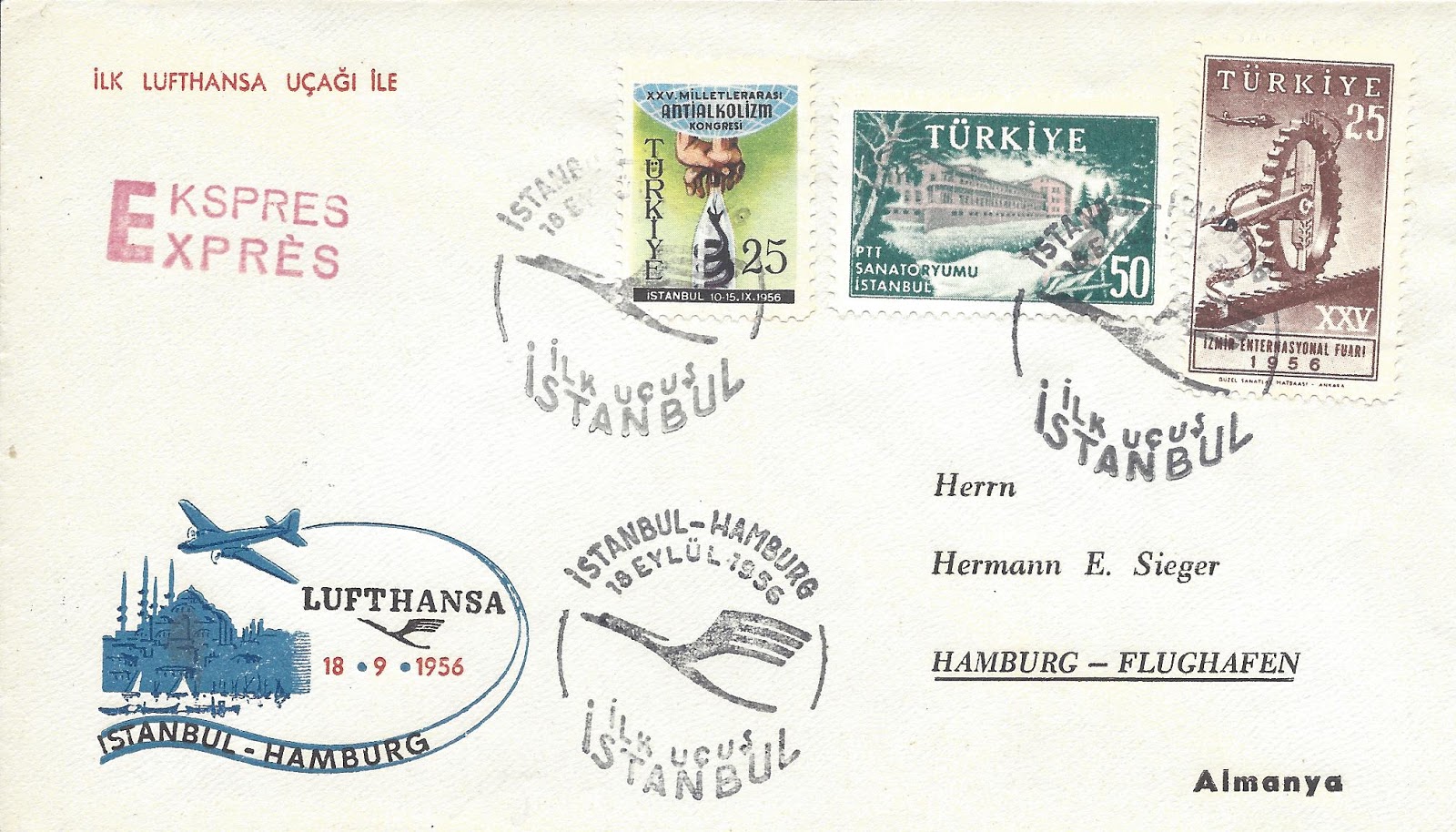 Alman pul tüccarı Hermann Sieger tarafından hazırlanan uçuş zarfı 15 Eylül 1956 tarihli İstanbul-Ankara uçuşu özel ilk uçuş damgalı.