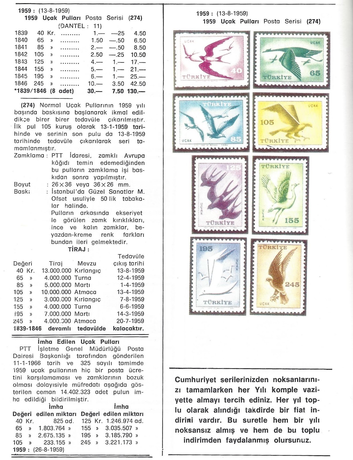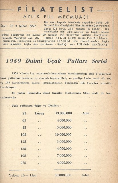 Uçak seferleri düzenli ve sürekli bir hale gelince uçak postası ile mektup gönderenler kısa sürede arttı, bu artışa paralel olarak uçak postası pullarına olan talepte çoğaldı. Ancak uçak posta ücretleri mektubun gideceği yere, mektubun basılmış kağıt olup olmadığına, taahütlü gönderilip gönderilmediğine ve ağırlığına göre çok farklılıklar gösterdiği için posta idaremiz 1959 yılında sekiz kuş resimli uçak postası pulu bastırmaya karar verdi. Avrupa uçak postası ücreti olan 105 kuruşluk pula olan gereksinim nedeni ile 105 kuruş atmaca resimli pul acele olarak bastırılarak kullanılmaya başlandı. Yukarıda İstanbul Filateli Derneğinin yayın organı olan Filatelist dergisinde bu pul serisi ile ilgili haber görülmektedir. Verilen bilgide en küçük valör 25 kuruş olarak görünürken gerçekte basılan serinin en küçük valörü 40 kuruş, en büyük valör 275 kuruş görünürken basılan serinin en büyük valörü 245 kuruştur. Ocak ayında kullanıma giren 105 kuruşluk puldan sonra diğer pullar Ağustos ayına kadar çeşitli tarihlerde kullanıma girmişlerdir. Anlaşılamayan bir şekilde dergideki yazıda basıldığı belirtilen ABD uçak postası ücreti olan 195 kuruşluk pul bir kaç ay sonra satışa verilmiş görünüyor. Aşağıda 1978 Pulhan kataloğunda pulların kullanıma giriş tarihlerine yer verildiği görülmektedir, ama metinde 105 kuruşluk pulun 13 Ocak 1959 tarihinde kullanıma girildiği söylenirken tabloda yanlışlıkla 13 Nisan 1959 tarihinin yazıldığına dikkat çekmek istiyorum.