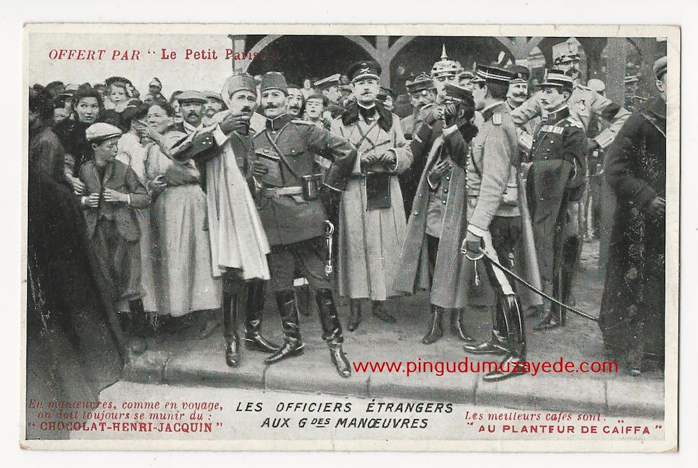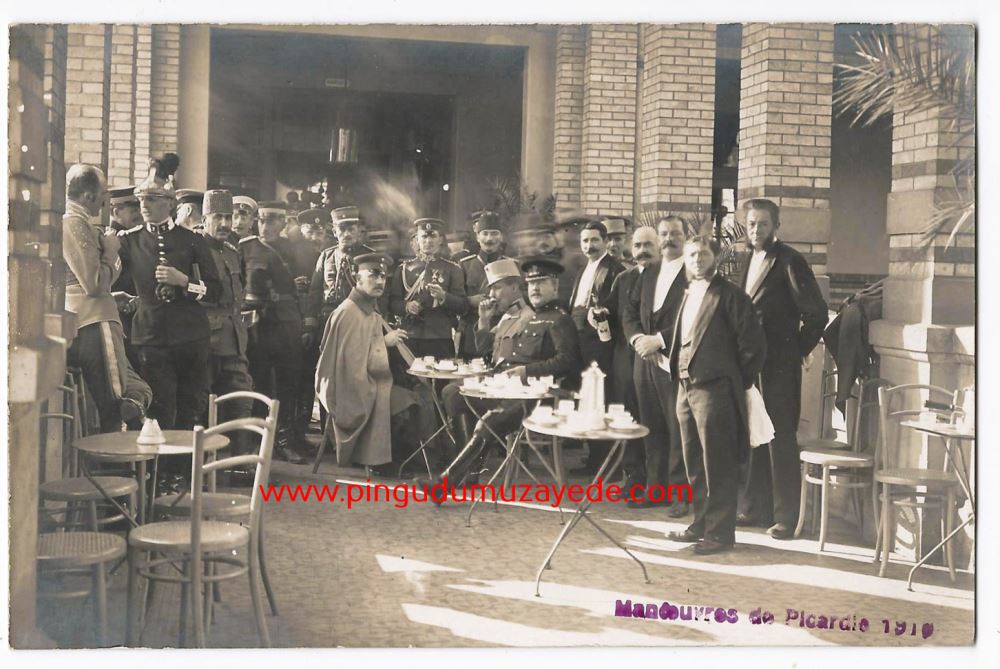 1910 yılında Fransa’da yapılan Büyük Picardie Manevraları sırasında Kolağası Mustafa Kemal Bey (Atatürk) resimli kartpostallar. Pingudu Müzayede Evi tarafından satışa konulan kartların resimleri onların internet sitesinden indirilmiştir.